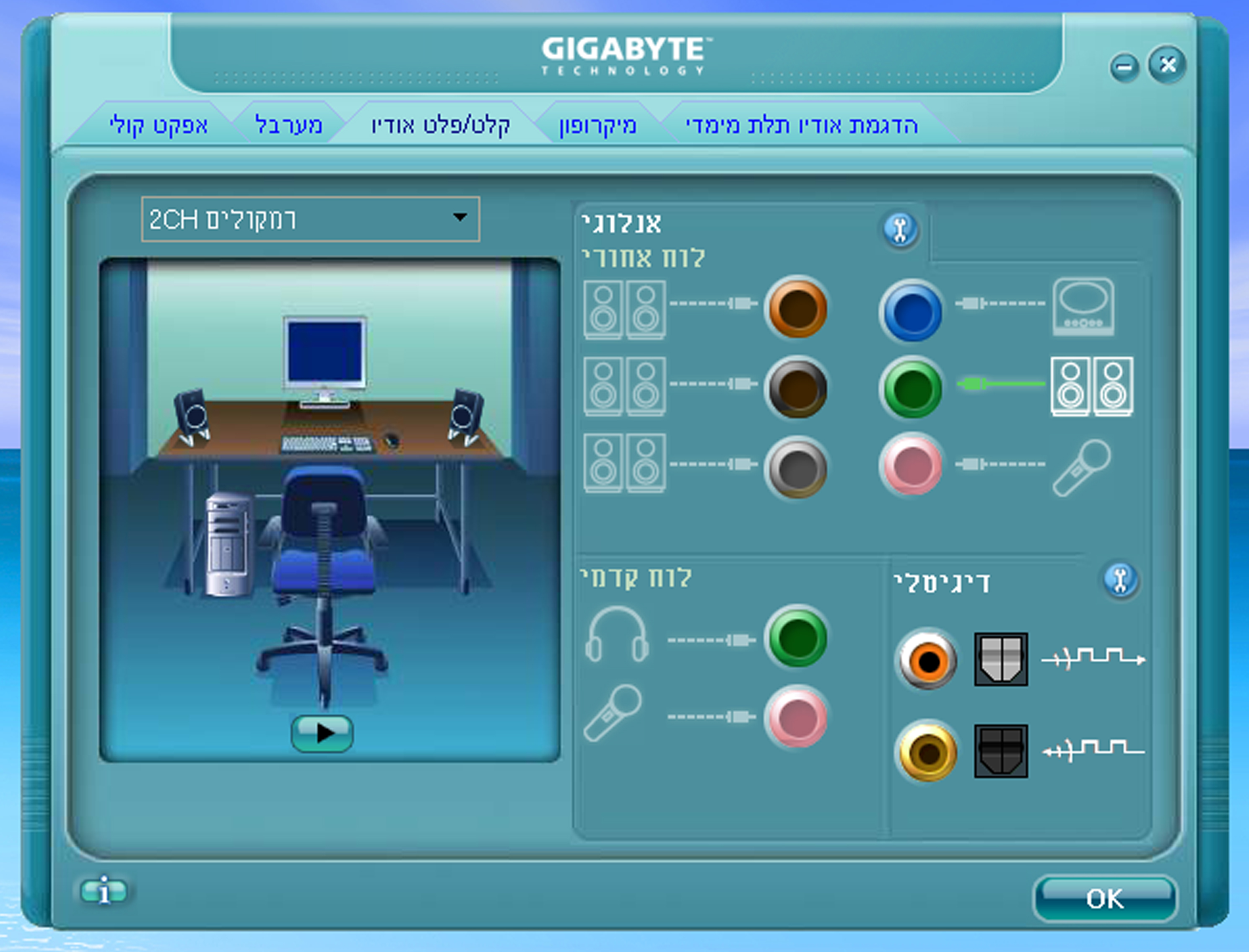 אוקיי לך ללוח הבקרה וחפש אייקון של ריאלטק, כלומר של חברת הכרטיס קול שלך, ותראה האם יש שם ציור של החיבורים של מאחורי המחשב של הכרטיס קול, ותעלה תמונה.