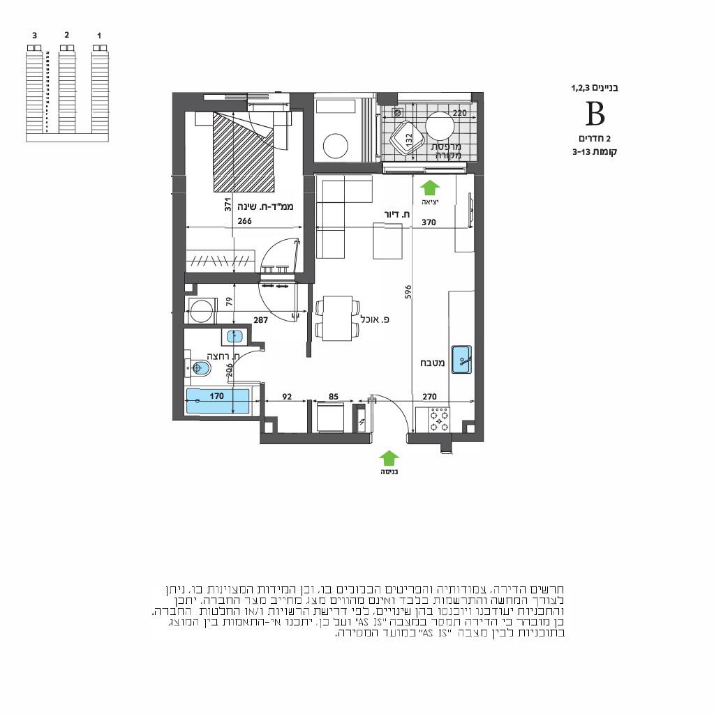בין 2 ל 5 דירות בקומה. מצרף קומה טיפוסית עם 5 דירות בה ניתן לראות את צורת ה'ש' באגף המזרחי בבניין כדי לתת כיווני אוויר לחדרים הכלואים - האיכות גרועה במקור: