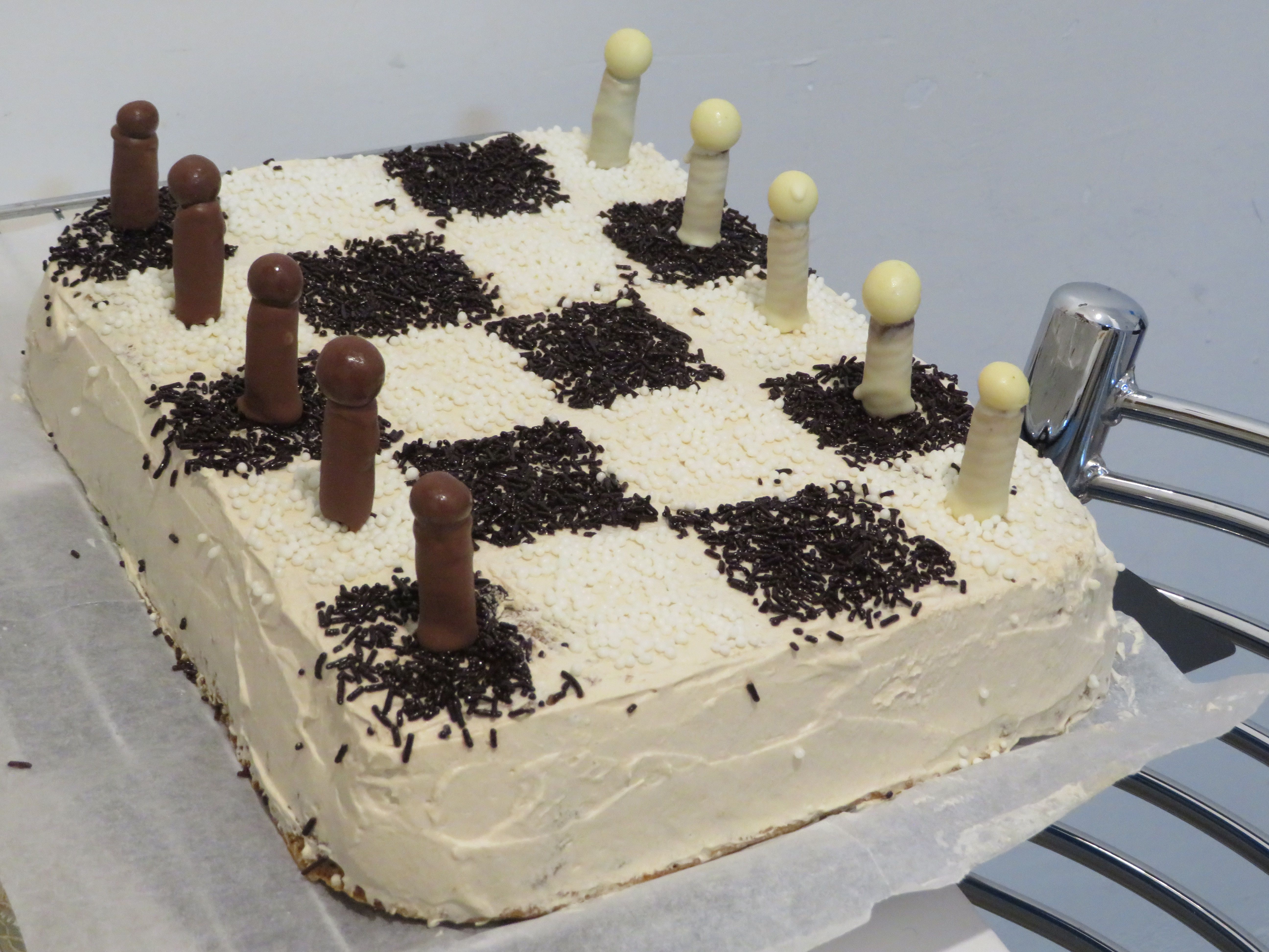 שנה שעברה עשיתי להורים שלי עוגה בצורת שחמט, קישטתי בחיילים מגליליות עם קליק למעלה (שחור ולבן), וכתבתי:
