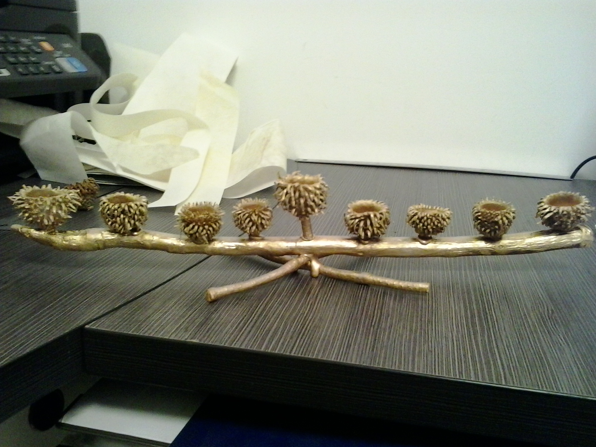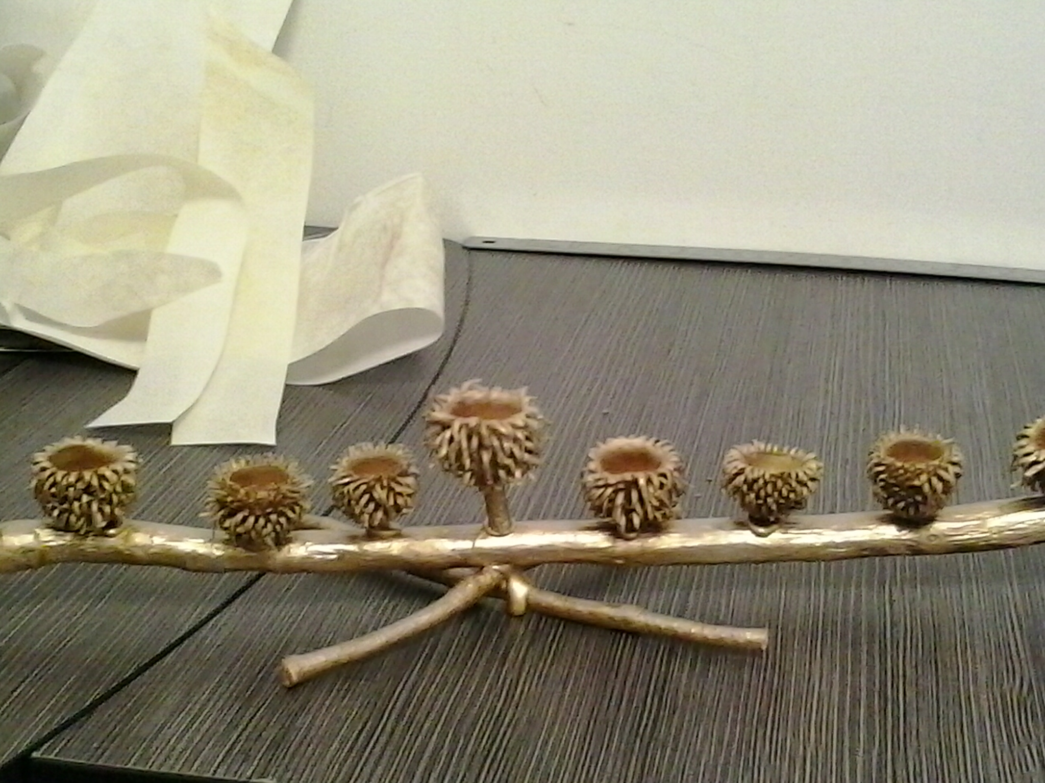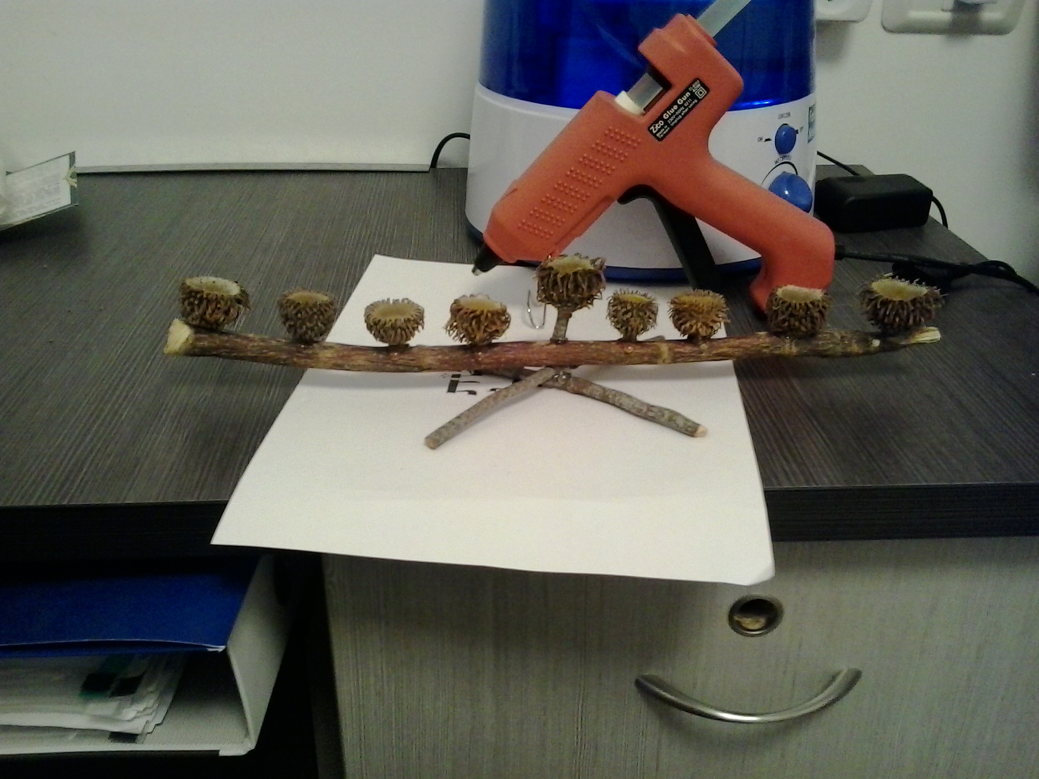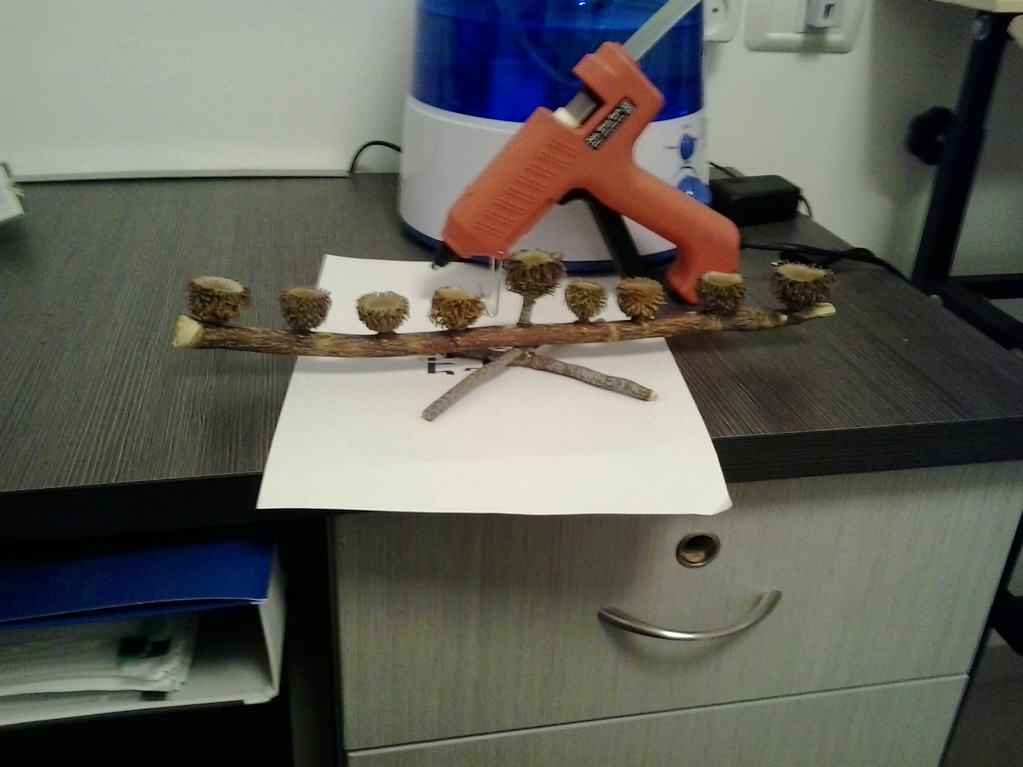 קצת שייפנו את העץ הדבקנו בדבק חם ולאחר מכן ריססנו בספריי זהב. יצא חמוד.