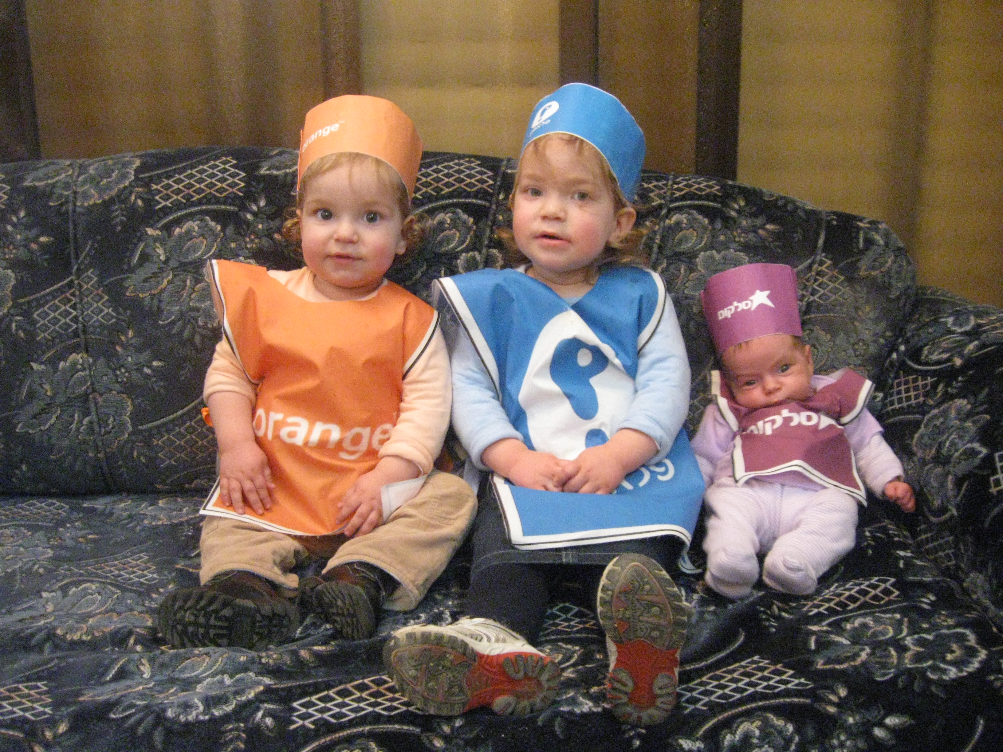 את השלושה שלי חיפשתי לסלקום, פלאפון ואורנג' ומאחורה היה רשום על כולם "יש תקשורת בינינו" התחפושת היתה קלה ונוחה לילידים (גם לביצוע היא נורא פשוטה) והיתה פשוט מדהימה!!!!!