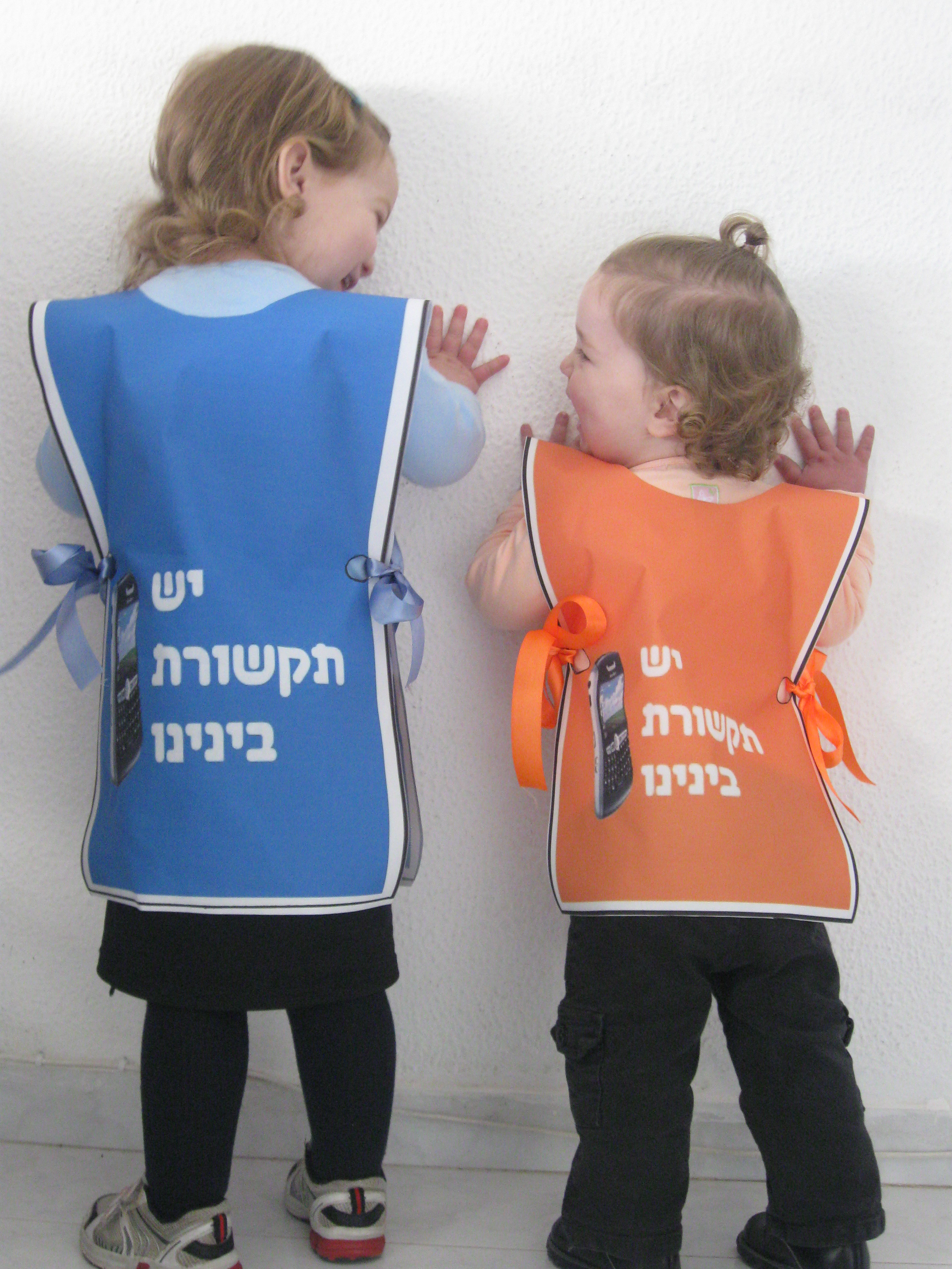 אני חיפשתי את שלושת הילדים שלי (הגדולה בת 3, השני בן שנתיים, והקטנה בת חודש!!) לסלקום, פלאפון ואורנג' ומאחורה היה רשום "יש תקשורת בינינו". התחפושת קלה ונוחה לילדים וגם לביצוע היא נורא פשוטה. היא היתה פשוט מדהימה!!!!!