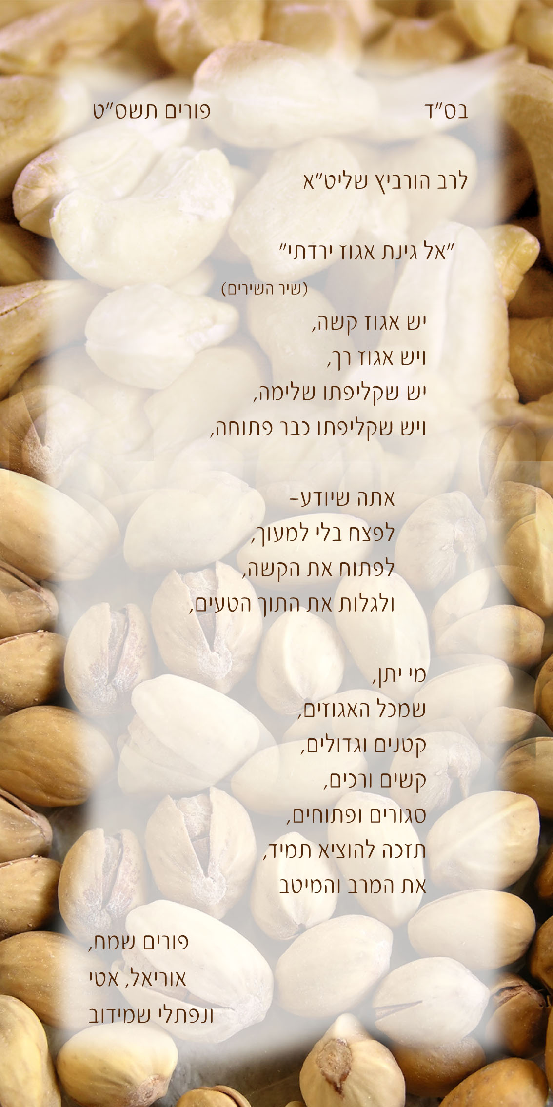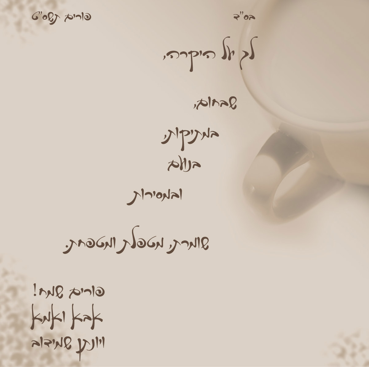 על משלוחי המנות של פסח ושל הקפה היו ברכות מתאימות מאד אישיות כך שלא אוכל להעלות אותן (זה היה להורים)