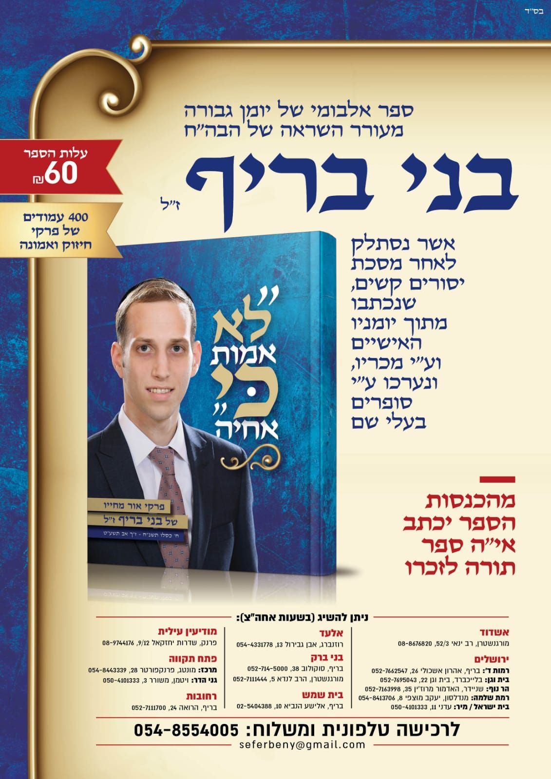 טרגדיה בב״ב: בדק׳ האחרונות נפטר לאחר מחלה קשה הבחור בנימין אשר בריף ז״ל. מבכירי תלמידי ישיבת מיר ברכפלד. בנו של איש החסד שוקי בריף.