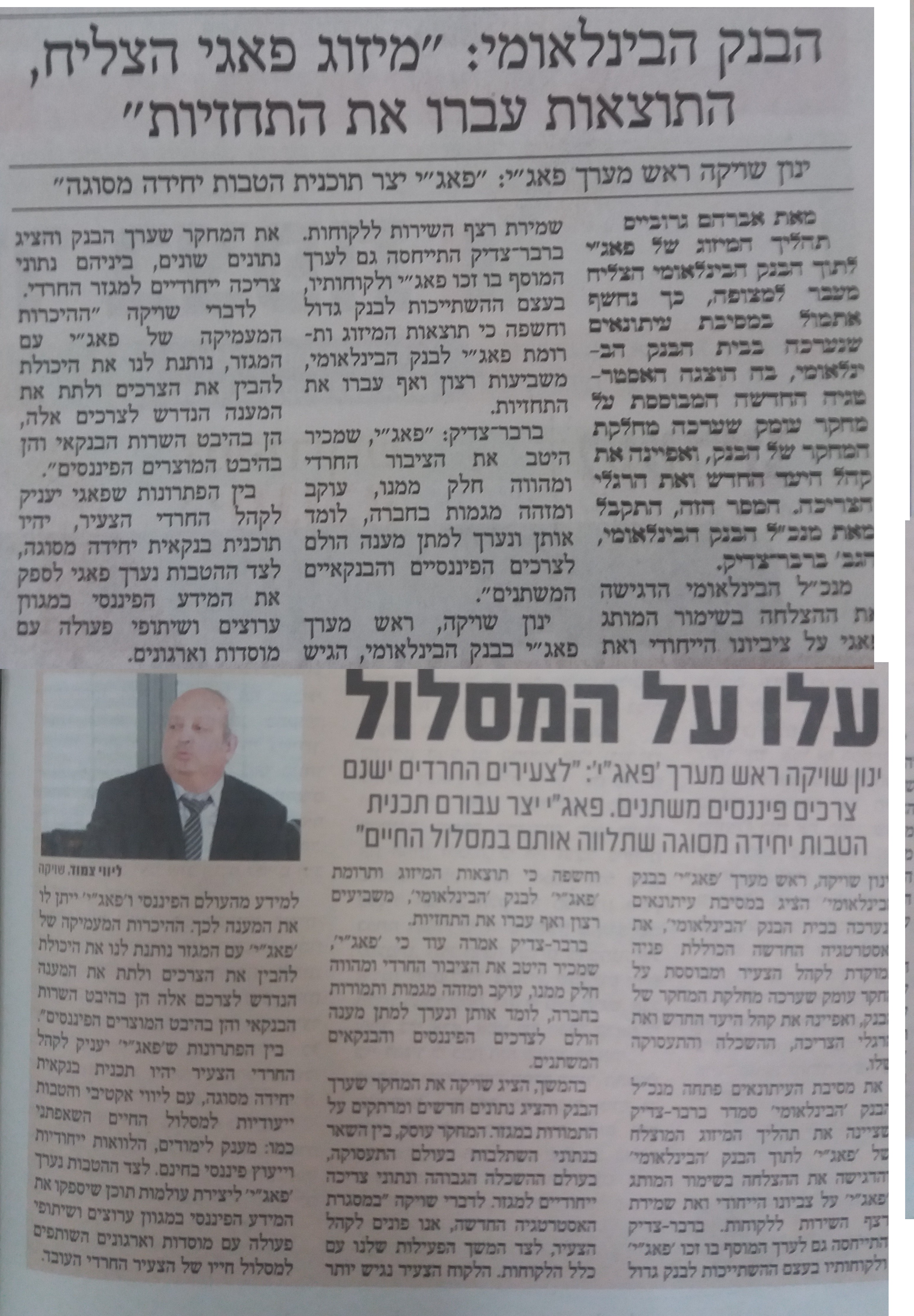 מה כתוב כאן? מיזוג בנק פאג"י עם קבוצת הבנק הבינלאומי הצליח. מנכל פאג"י: החשיבות שמייחס בנק פאגי בלה בלה. מנכל הבינלאומי: בלה בלה בלה. הבנק ממשיך להוביל בלה בלה בלה. הקשר החם למגזר בלה בלה בלה.