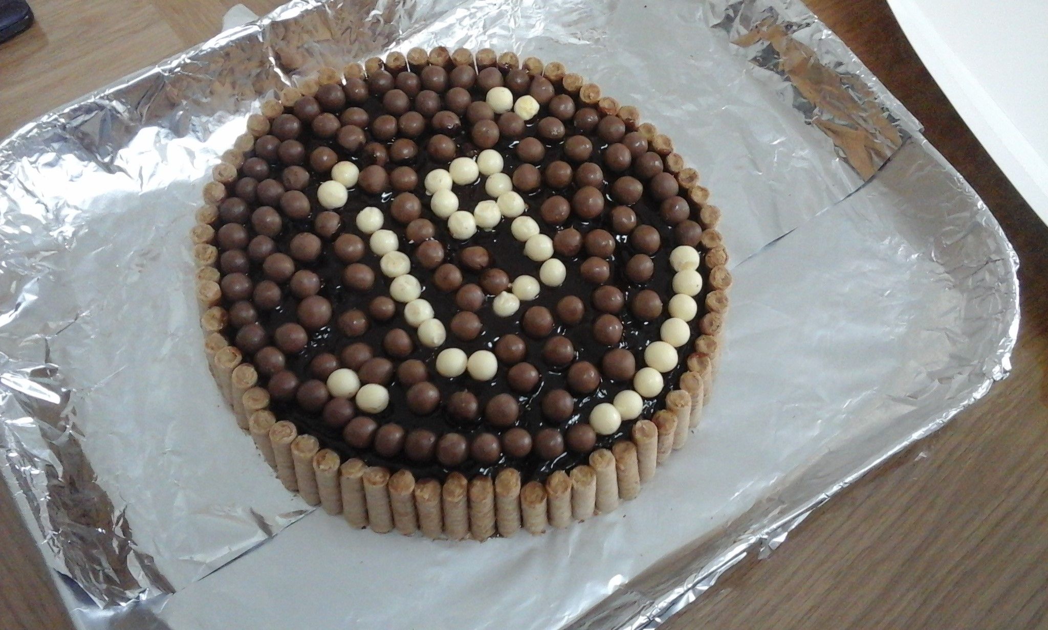 לאחר מכן מיישרים עם לקקן או פלטה את הגנאש מסביב לעוגה. בסופו של דבר על העוגה צריכה להיות מצופה בשוקולד ולא נורא אם יש בליטות או אי דיוקים – הגנאש לא ממש ייראה וכל תפקידו הוא להדביק את הקליקים ואת הגליליות לעוגה.
