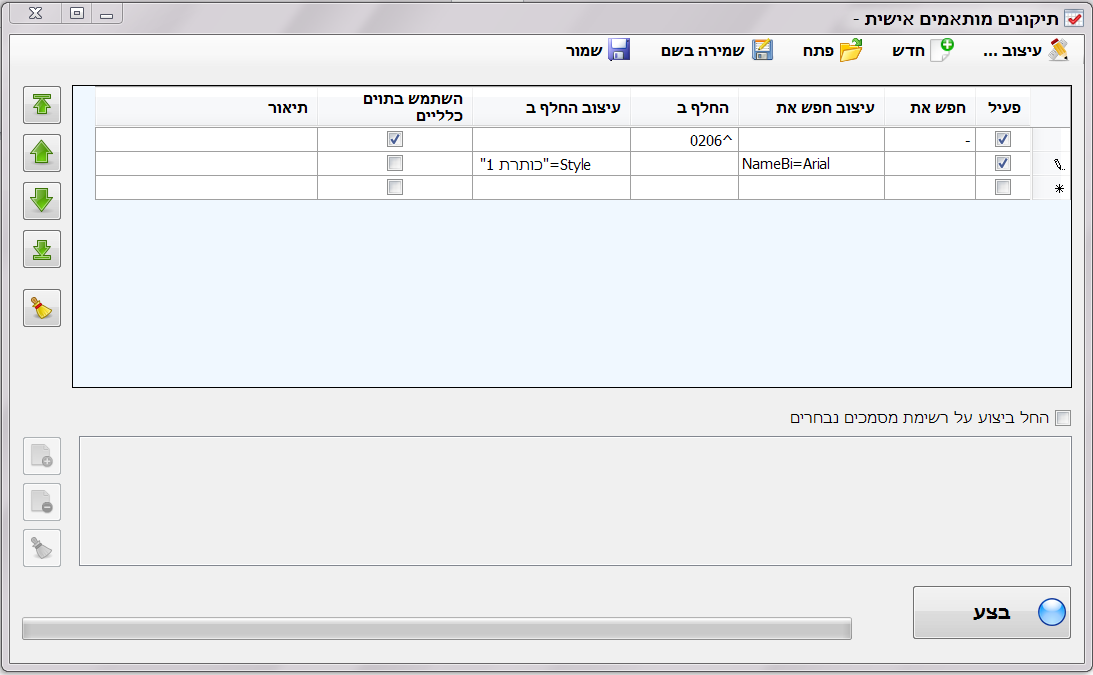 יש טבלה שכל שורה מכילה את פרטי החיפוש וההחלפה עם העיצובים שלהם, ויש דיאלוג לבחירת עיצוב.