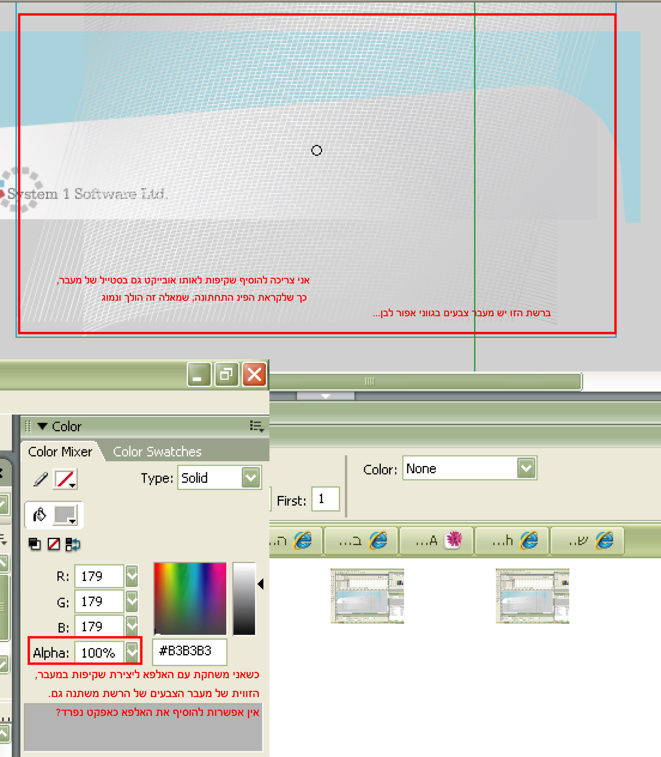 עכשיו, מדובר באובייקט עם מעבר צבעים בכיוון אחד, ורציתי להוסיף שקיפות מזווית אחרת , אבל כרגע כשאני עושה שקיפות בפלאש זה משנה לי גם את הזווית של מעבר הצבעים... מה עושים???