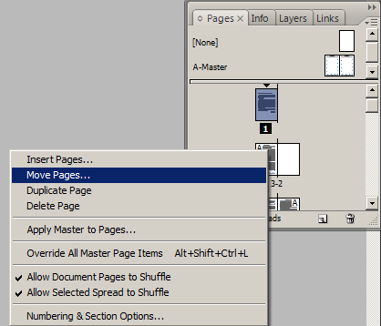 בחר 'פריסה' > 'עמודים' > 'העבר עמודים', או בחר 'העבר עמודים' מתפריט החלונית 'עמודים'.