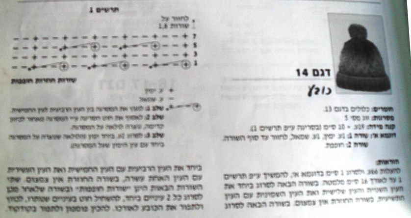להעלות 66 ע' ולסרוג 1 ס"מ בדוגמא א', להמשיך עפ"י תרשים 1 עד לאורך 16 ס"מ מלמטה, בשורה הבאה לסרוג ביחד את העין השניה והעין השלישית, ואת העין השמינית עם העין התשיעית, בשורה החוזרת אין צמצום. בשורה הבאה לסרוג ביחד את העין הרביעית עם העין החמישית ואת העין העשירית עם העין האחת עשרה, בשורה החוזרת אין צמצום. שתי השורות הבאות הינן "שורות חופפות" ובשורה שלאחר מכן לסרוג כל 2 עיניים ביחד, להשחיל חוט בעיניים שנותרו, לכוון ולתפור את הכובע לאורכו, להכין פונפון ולתפור בקדקוד.