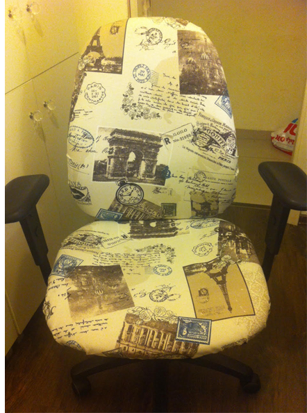 את יכולה להוסיף צבע בצורה ממש פשוטה ע"י צביעה של מספר פסי אורך בעובי משתנה בגוונים שלקוחים מריפוד הכסא. (גווני חום וכחול, לטעמי עם דגש על הכחול)