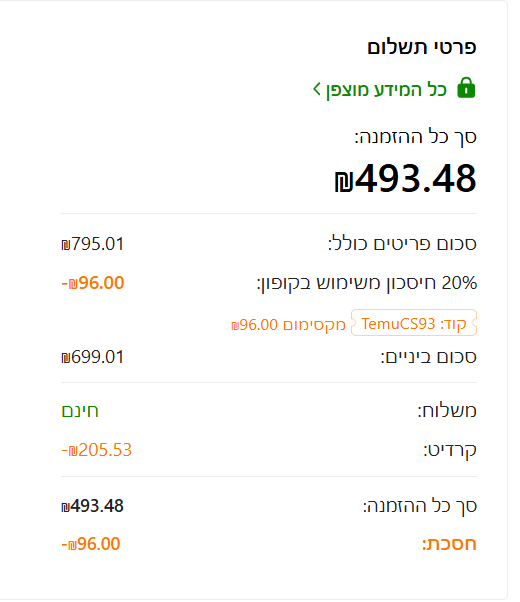 הנחה מהחזרים על הזמנה קודמת-200 ש"ח