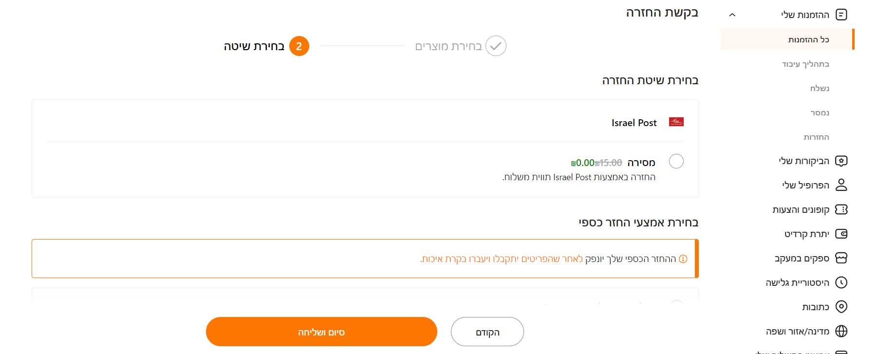 בדיוק באתי לכתוב גםהאופציה של החזרות על ידי שליח כבר לא מופיע אצלי. יש לי אפשרות להחזיר רק בדואר.