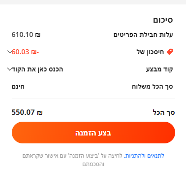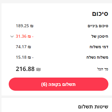 ואם אני משלם באשראי?זה באג של עלי, תלחץ על תשלום בפאיפל ושם תראה מה באמת הסכום לתשלום