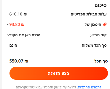 זה באג של עלי, תלחץ על תשלום בפאיפל ושם תראה מה באמת הסכום לתשלוםרציתי לשאול למה כשאני שם קוד מבצע הוא רק כותב -93 אבל בפועל הוא לא מחשבן את זה אלא רק מינוס 60 שכבר היה?