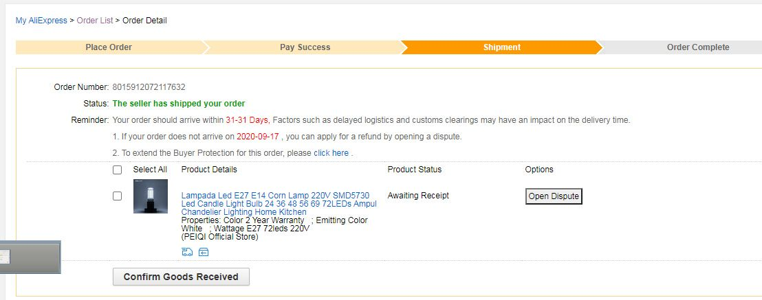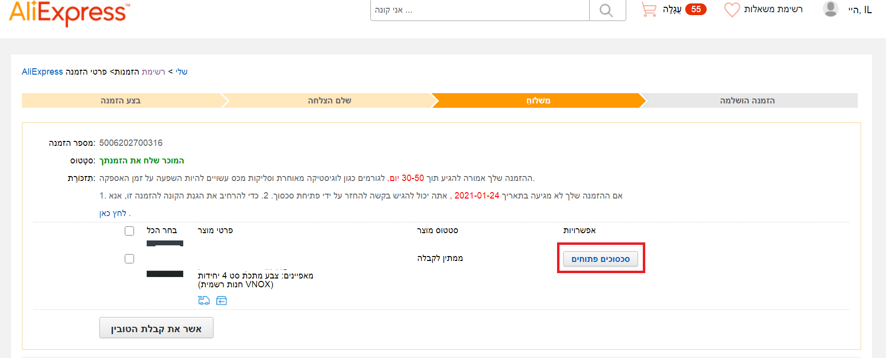 ניתן לסמן שהמוצר הגיע, או ללחוץ על פתח סכסוך - Open Dispute