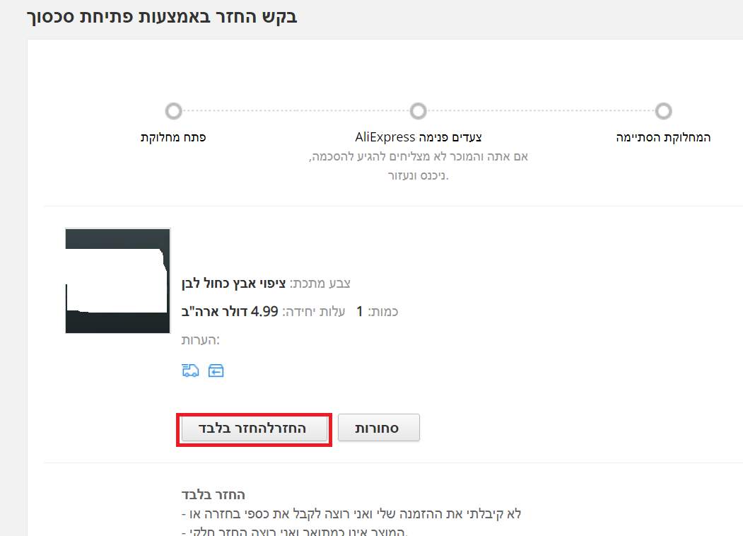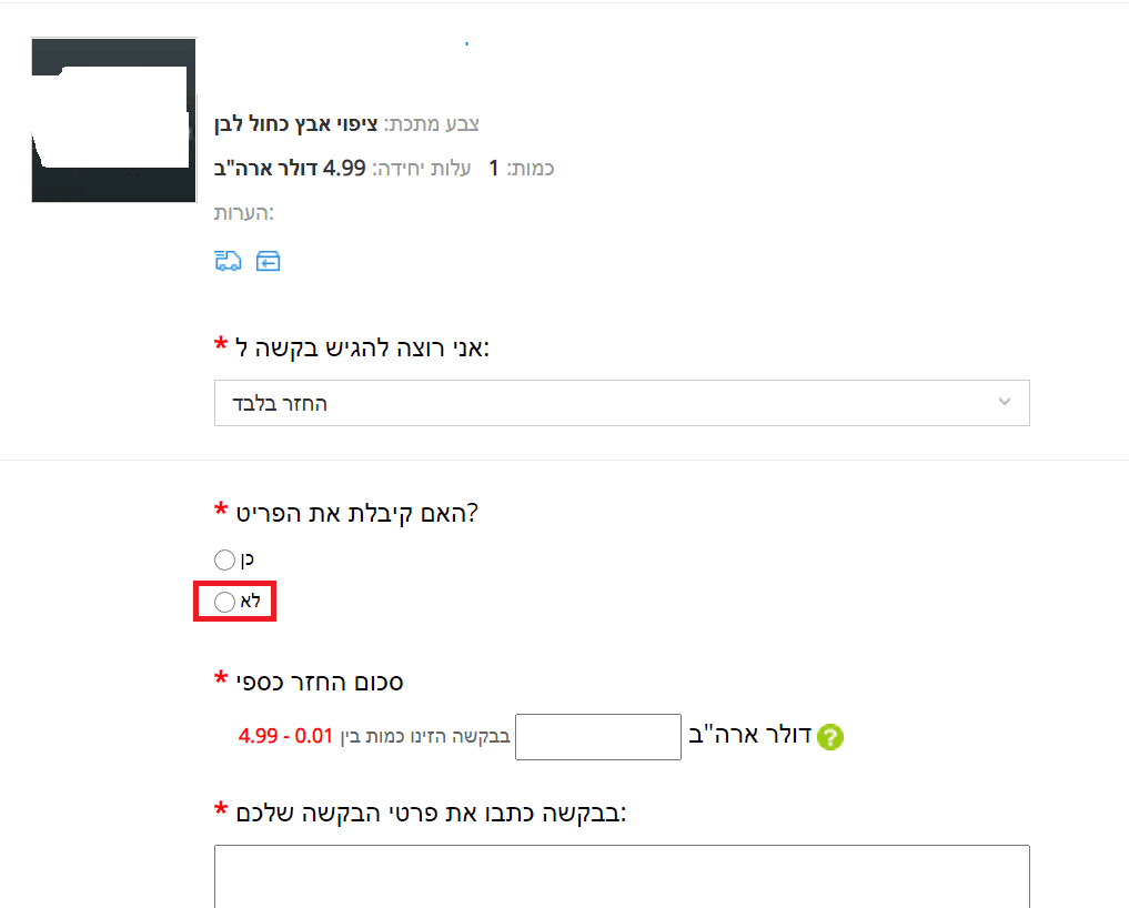 אח"כ כאן תלחצי על 'החזר כספי בלבד' (או מה שלא יהיה כתוב שם.. זה כל פעם מתרגם משהו אחר)