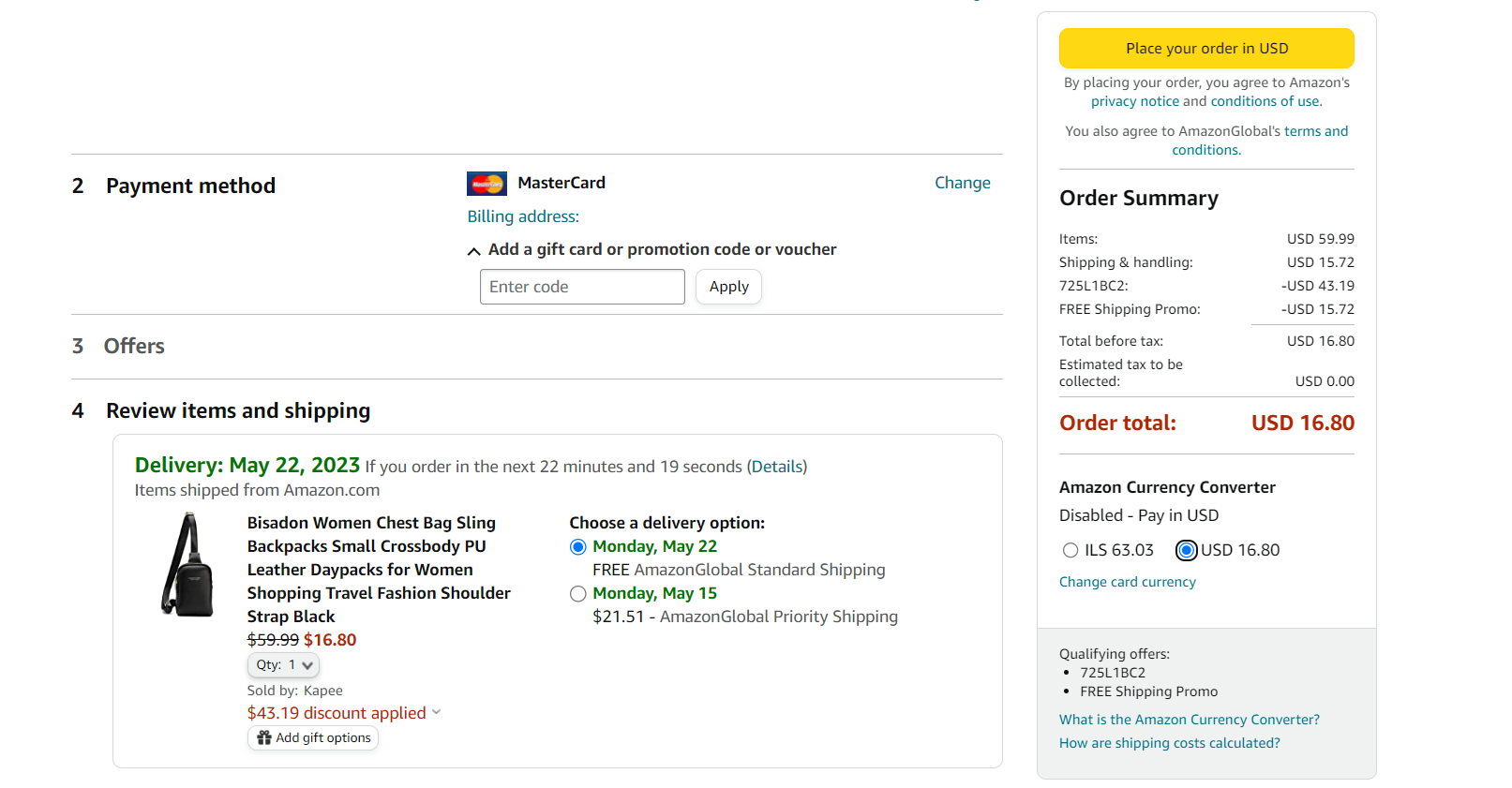נניח הוספתי לסל מוצר בשווי 60 $ (220 ש"ח לצורך העניין), שזכאי למשלוח חינם לארץ.