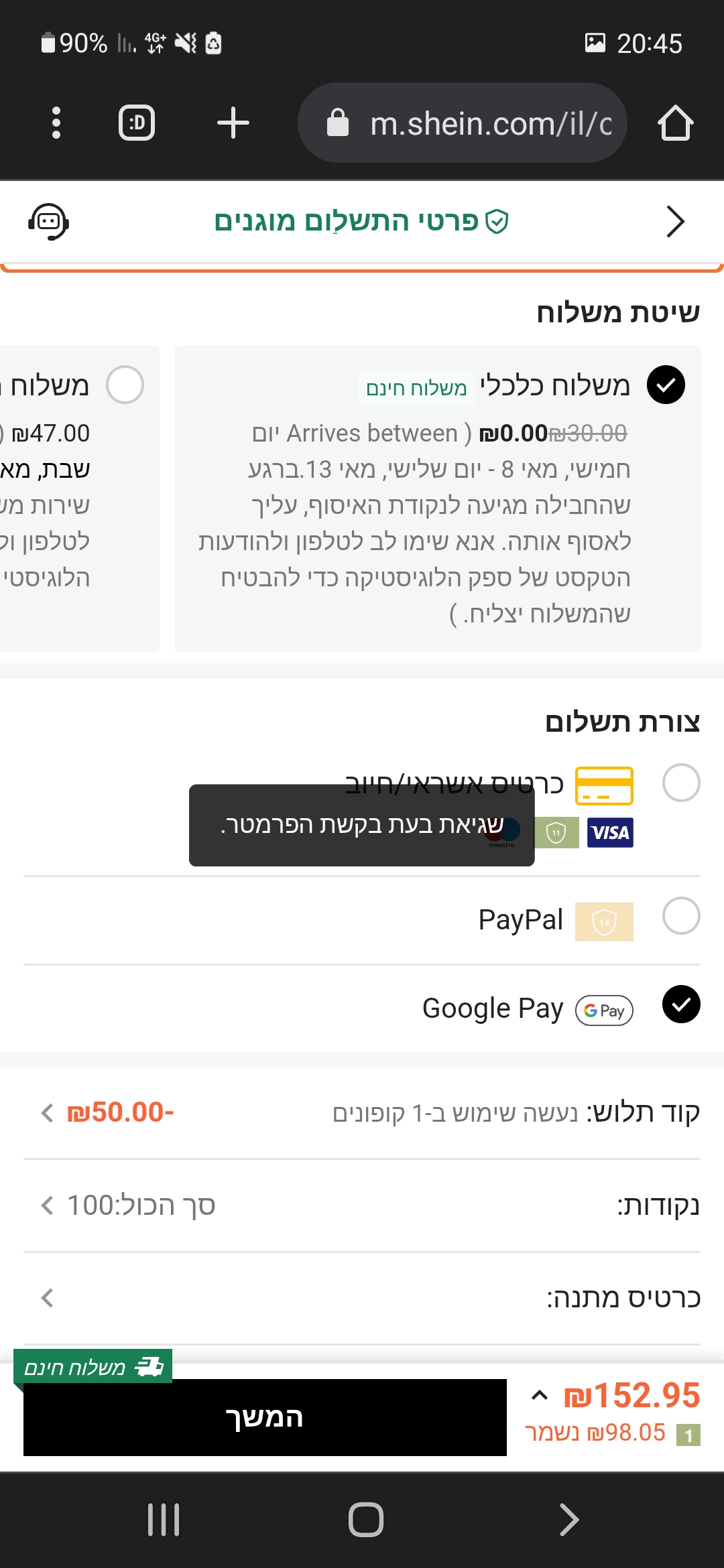 אני לא מצליחה לשלם, כשאני בוחרת אם אני רוצה לשלם בpaypal או בכל אפשרות אחרת זה כותב לי שגיאה כמו שכתוב בתמונה המצורפת