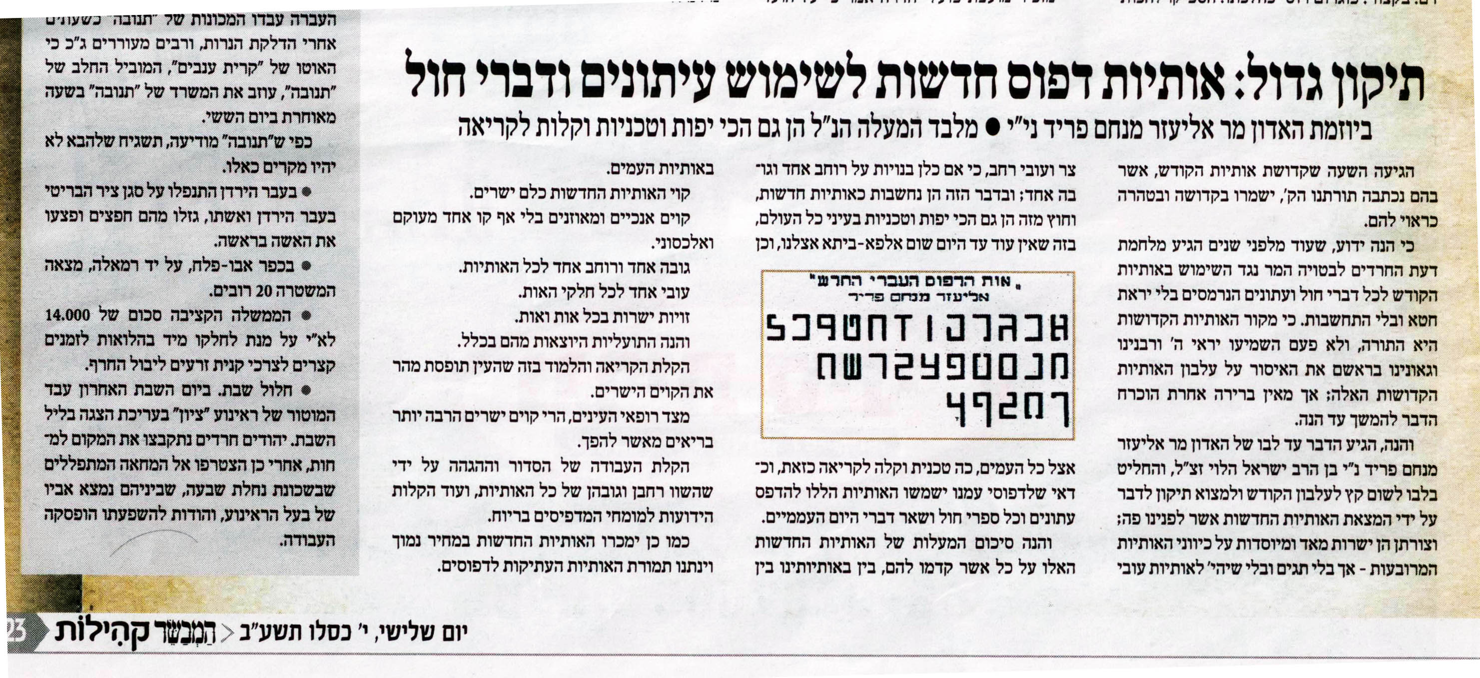 חבל שאין עוד גזיר עיתון היסטורי המלמד מדוע הדפוסים לא קיבלו בהתלהבות את האלפא ביתא החדש. (איך אפשר לקרוא לזה "פונט"?) תארו לעצמכם, עיתון ללא קווים עקומים -תאווה לעיניים!