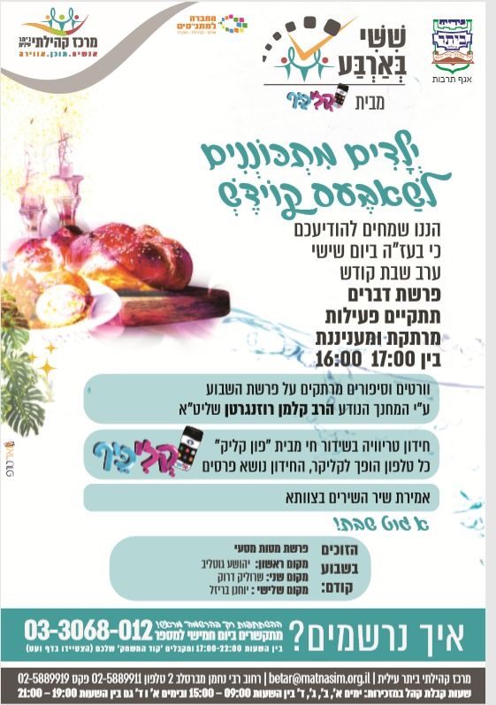 מזה שבוע רביעי שהמרכז הקהילתי בביתר מפעיל לילדי העיר את מיזם "שישי בארבע" - התוכנית שמפעילה את ילדי העיר למשך כשעה וחצי דרך הטלפון בסיפןר לשבת, חידון על פרשת השבוע, שיר לשבת וסיום עם אמירת שיר השירים בצוותא.