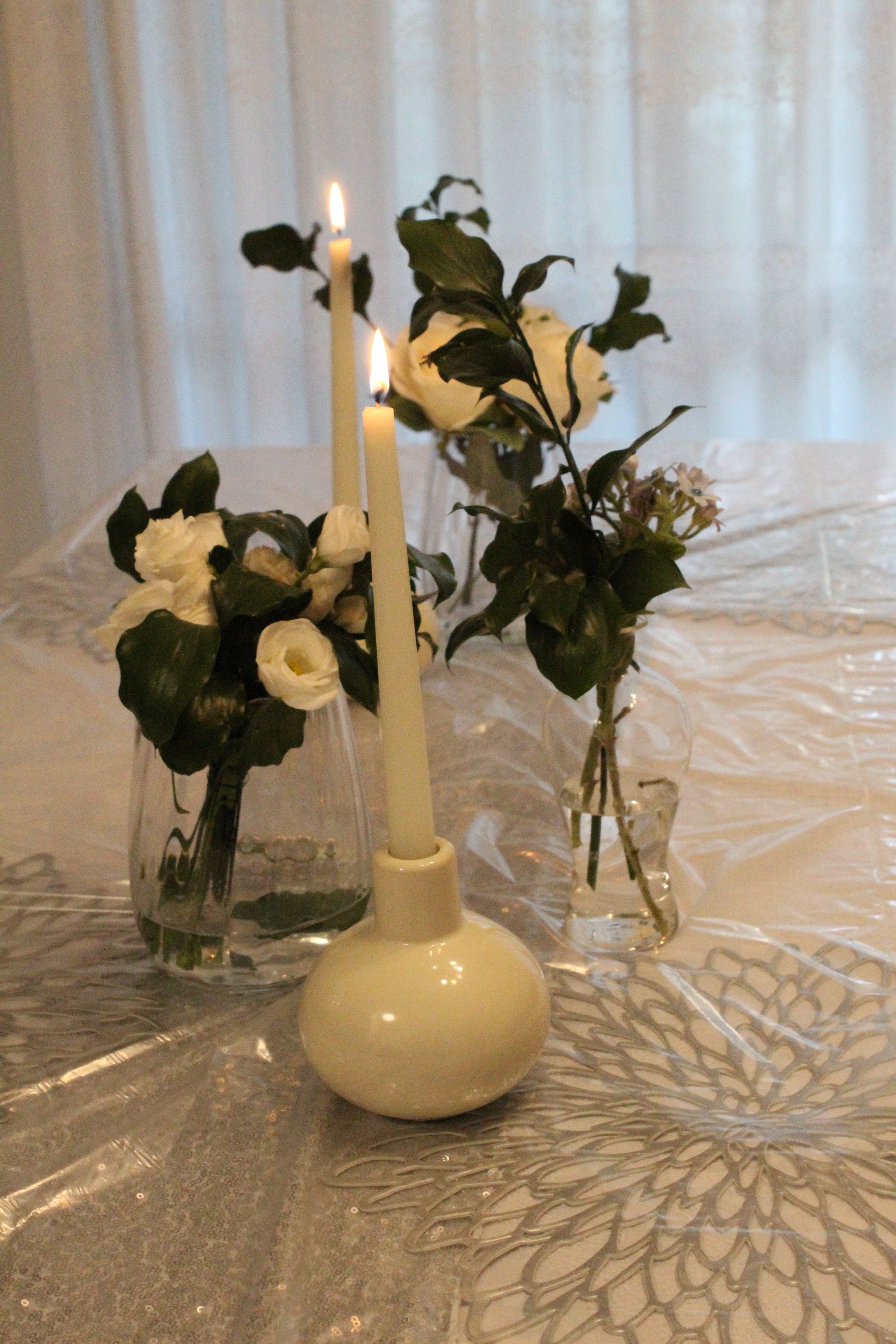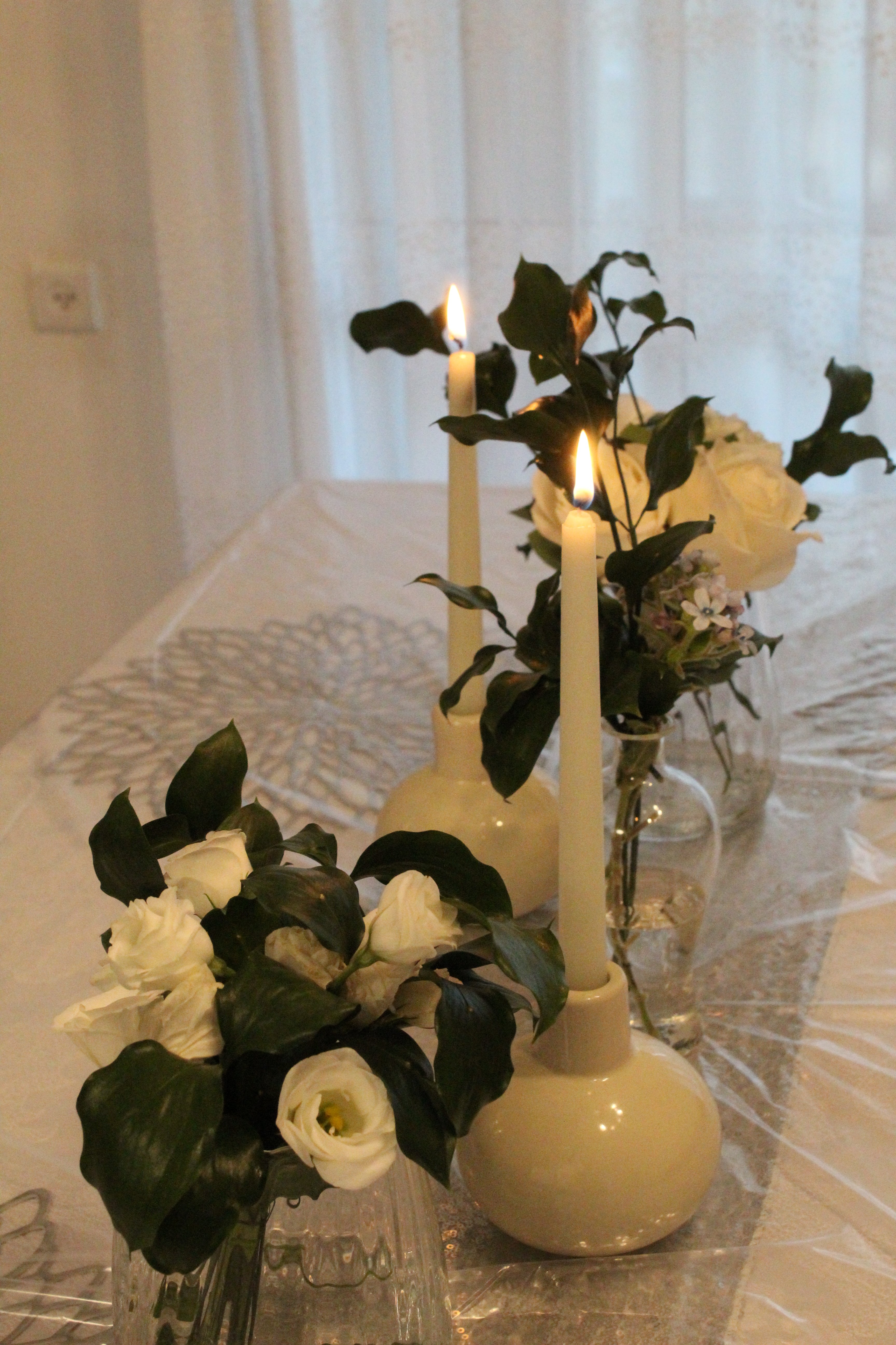 שזירת פרחים באגרטלי זכוכית בשילוב נרות