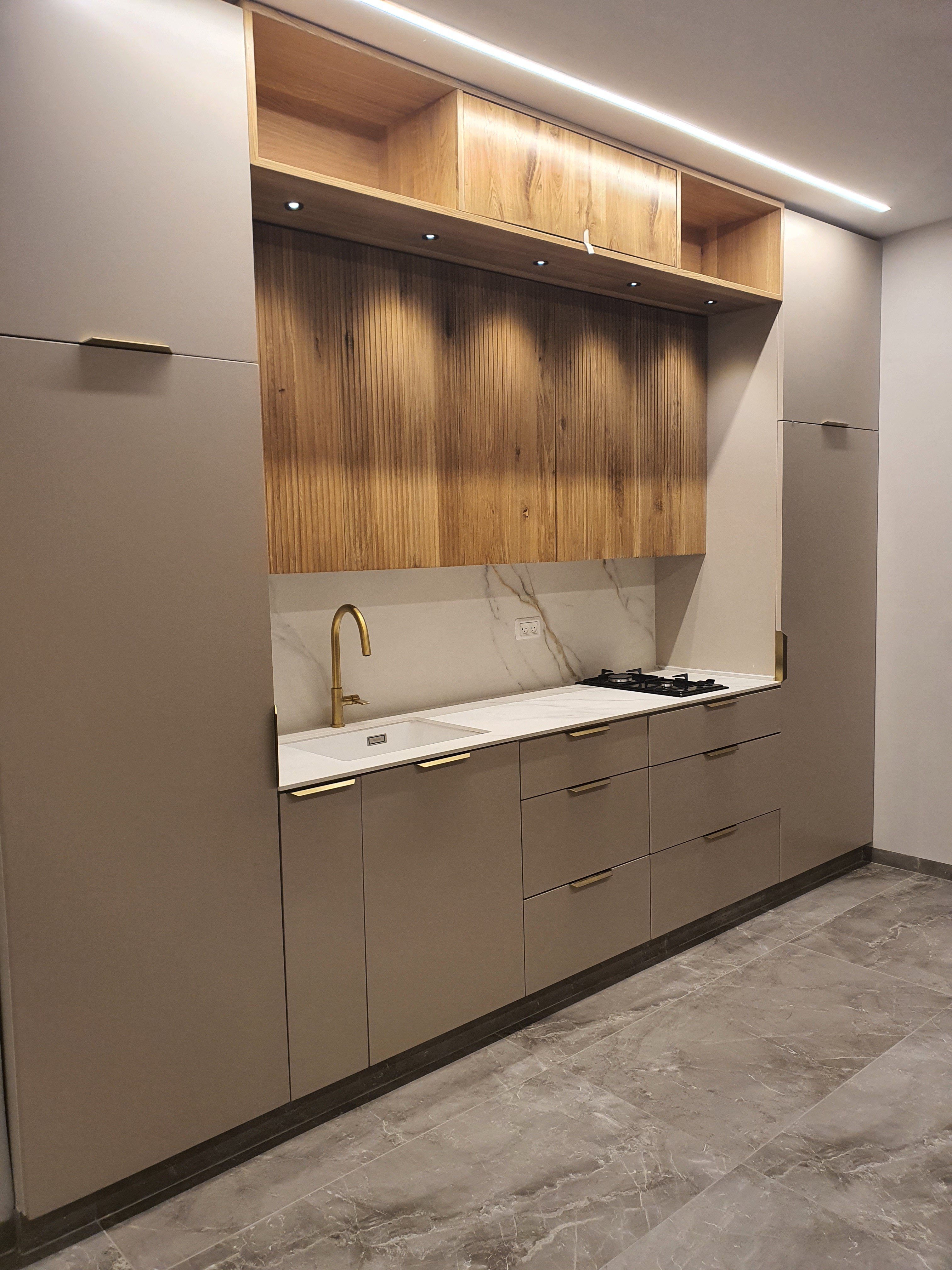 עיצוב שייש שמנת/בז' עם גידים זהב דקים .