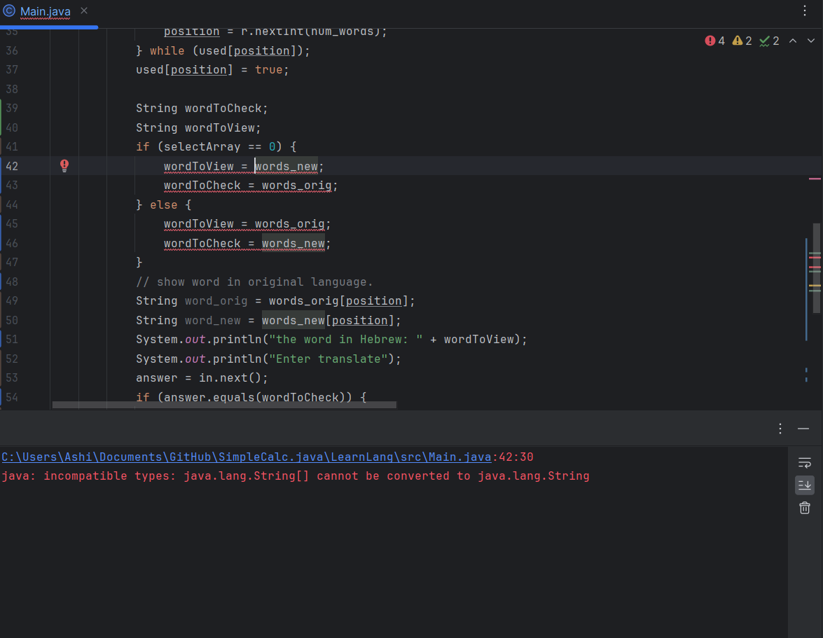 if ((selectArray == 0 && answer.equals(wordNew)) || (selectArray == 1 && answer.equals(wordOrig))) {