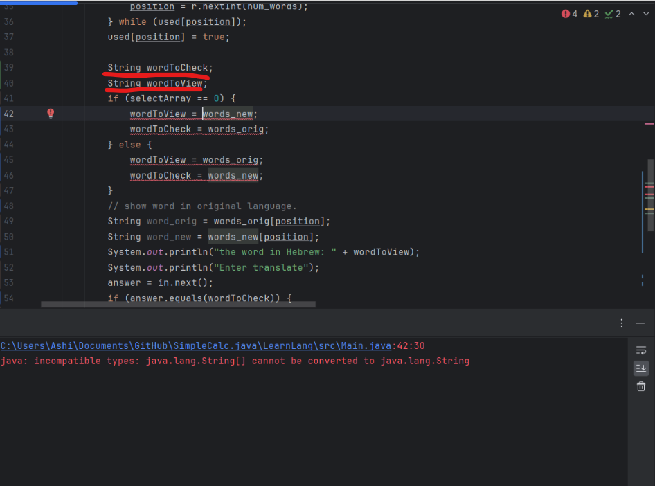 המצביעים האלה: wordToView ו wordToCheck. מצביעים כל פעם על מערך אחר (אנגלית או עברית) עפ"י הגרלה.