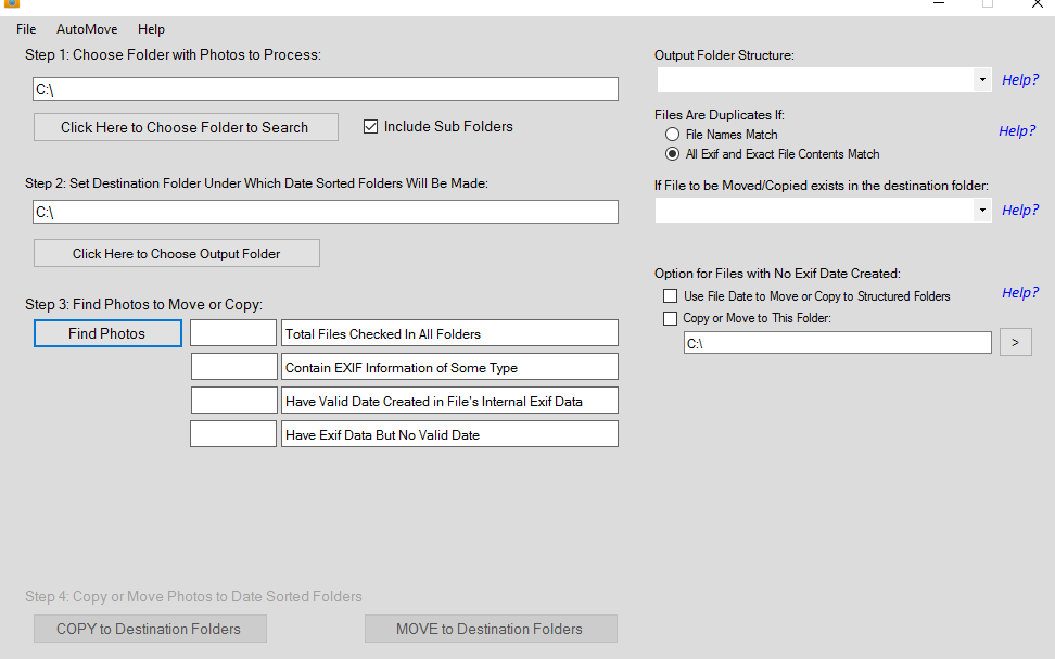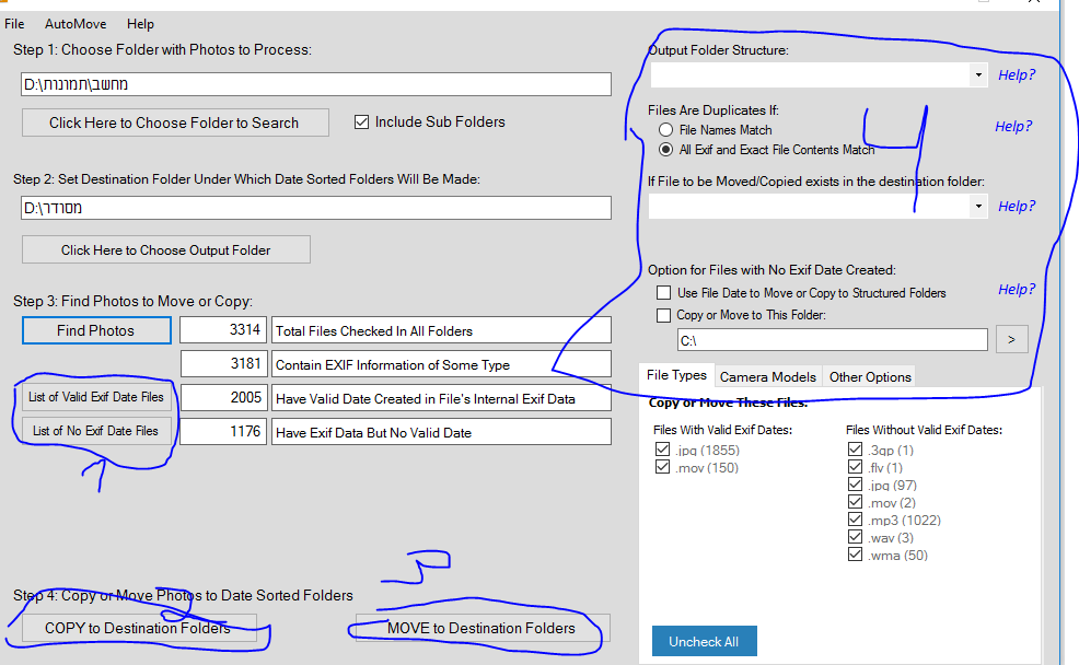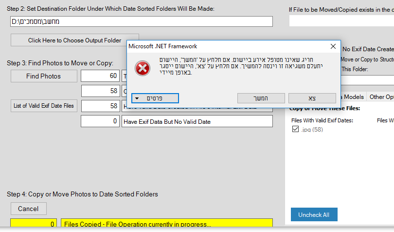 בעצם הוא פטר אותך עקב תקלה מהקשת מייל וסיסמא, בכל מקרה בשורה העליונה אתה מזין את התיקייה \ הכונן שברצונך לסרוק כדי למצוא תמונות ובשורה השניה מתחת אתה מציין את כונן היעד בו יווצרו התיקיות החדשות המסודרות - בלחיצה על Find Photos התהליך של הסריקה יתחיל ולאחר מכן אתה בוחר האם להעביר את התמונות כך שרק היעד יישאר או להעתיק אותן כך שגם המקור יישאר - מומלץ יותר כמובן.