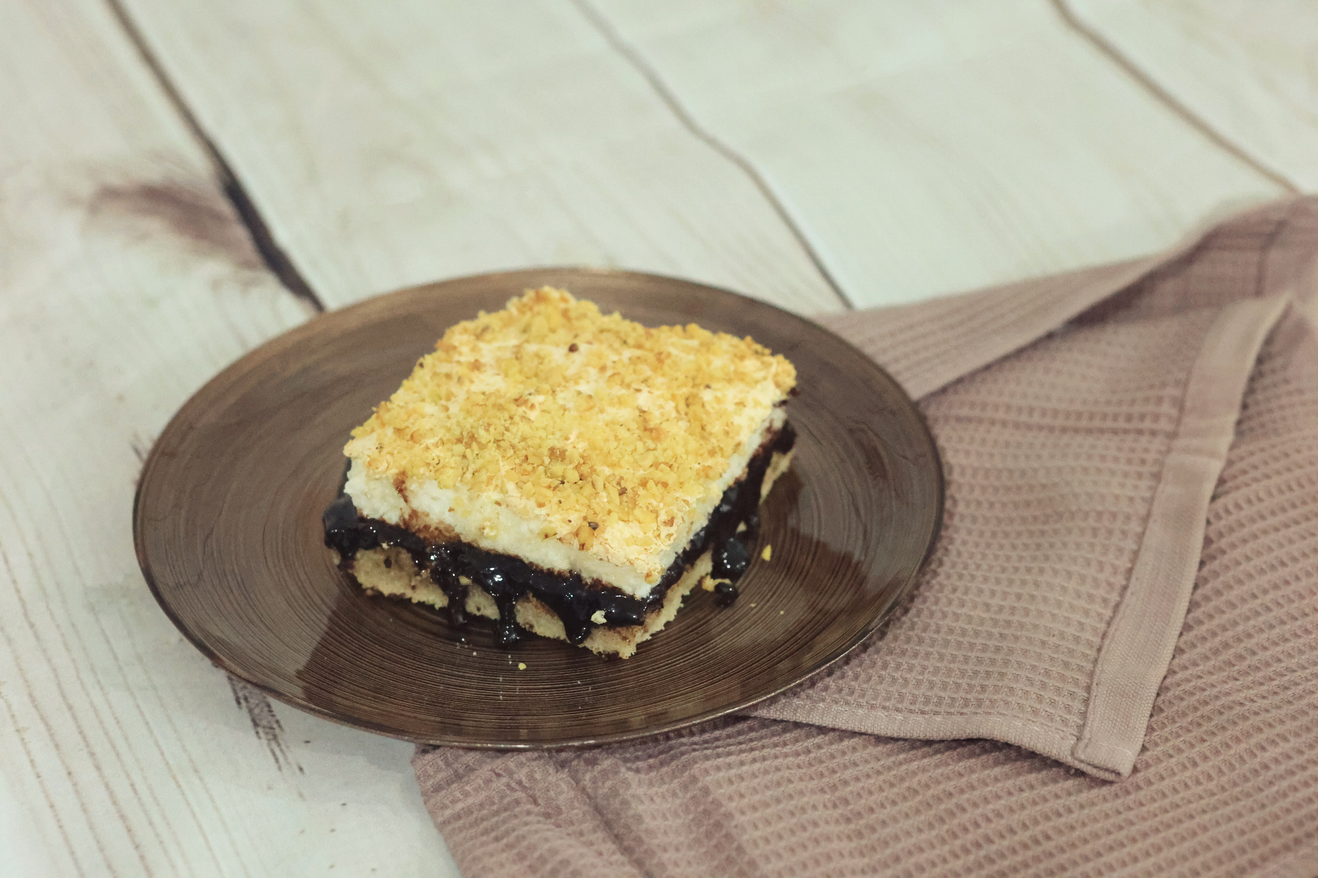 קרדיט: FoodFromStart - עוגת שכבות בניחוח יין עם אגוזים שוקולד וקוקוס במרקם ענני