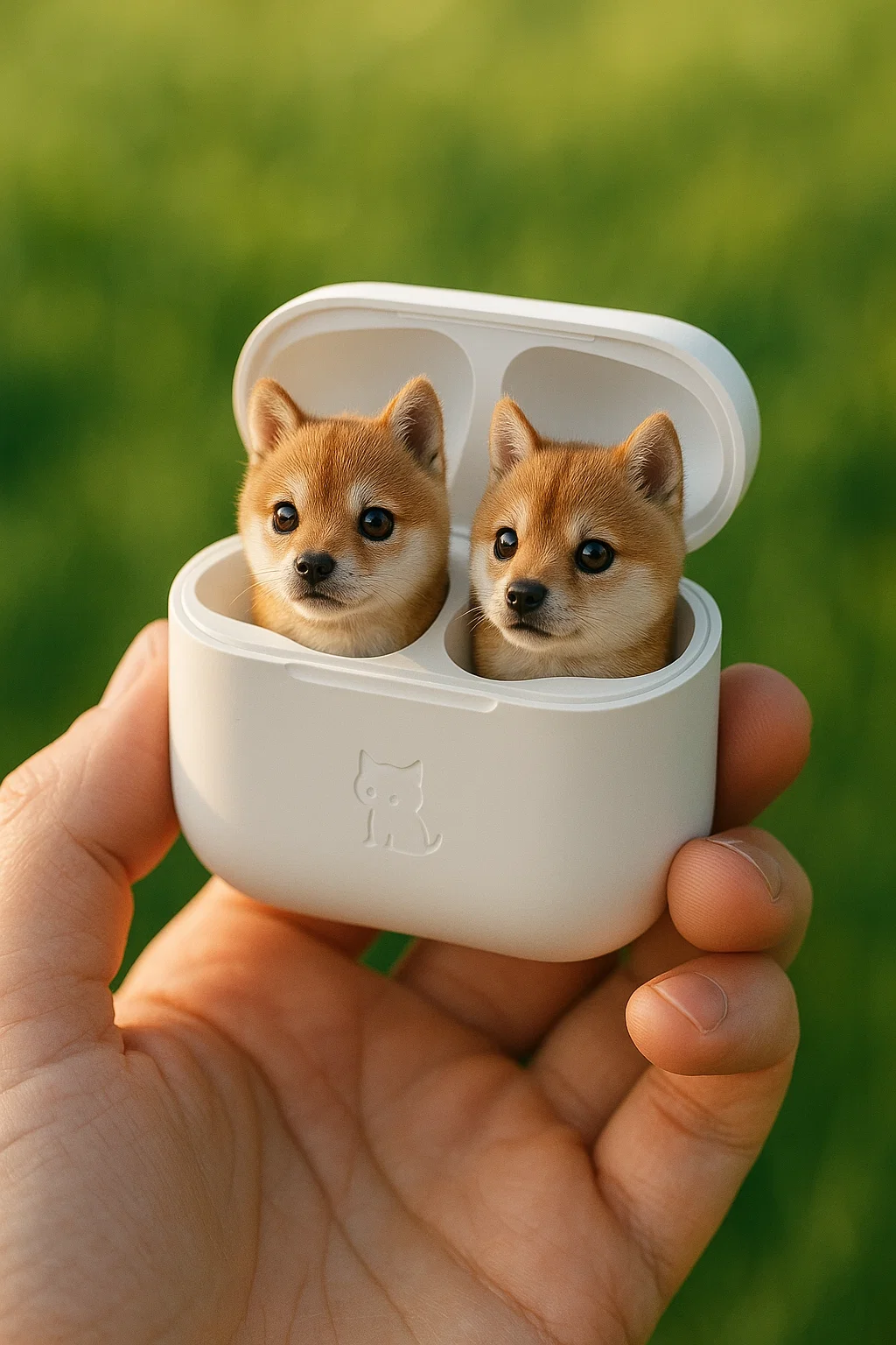 יד שמחזיקה קופסה לבנה שנראית כמו קופסת טעינה לאוזניות. בתוך הקופסה, במקום אוזניות, יושבים שני גורים קטנים וחמודים עם פרווה כתומה-לבנה ועיניים סקרניות. הרקע ירוק ומטושטש, מה שמבליט את הגורים. על הקופסה יש ציור קטן של חתול. התמונה ערוכה בצורה יצירתית ומצחיקה, כאילו הגורים הם אוזניות.