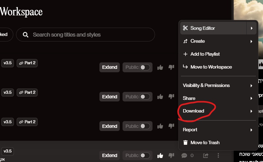 כנראה אתה מתכוון לשירים שאחרים יצרו...אין לי אופציה להוריד.