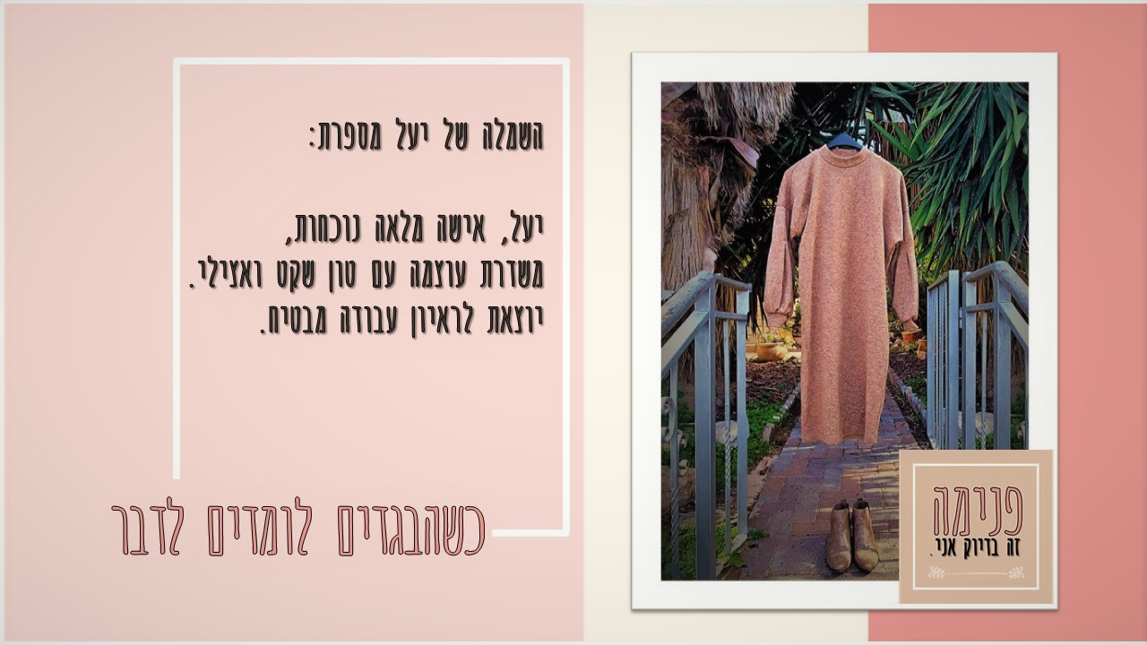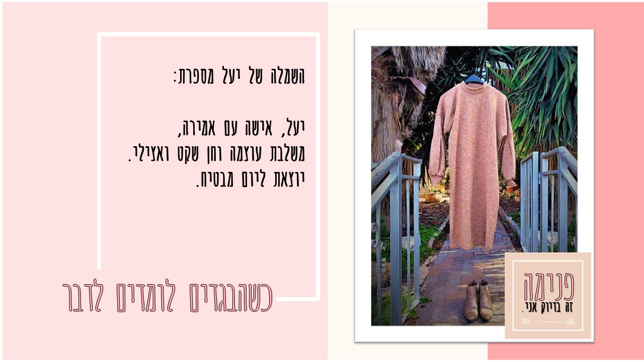 משפט ההבטחה: את לבושה מדוייק- מרגישה בנוח- יוצאת ליום הרבה יותר נינוחה לבטא עצמך לעולם.