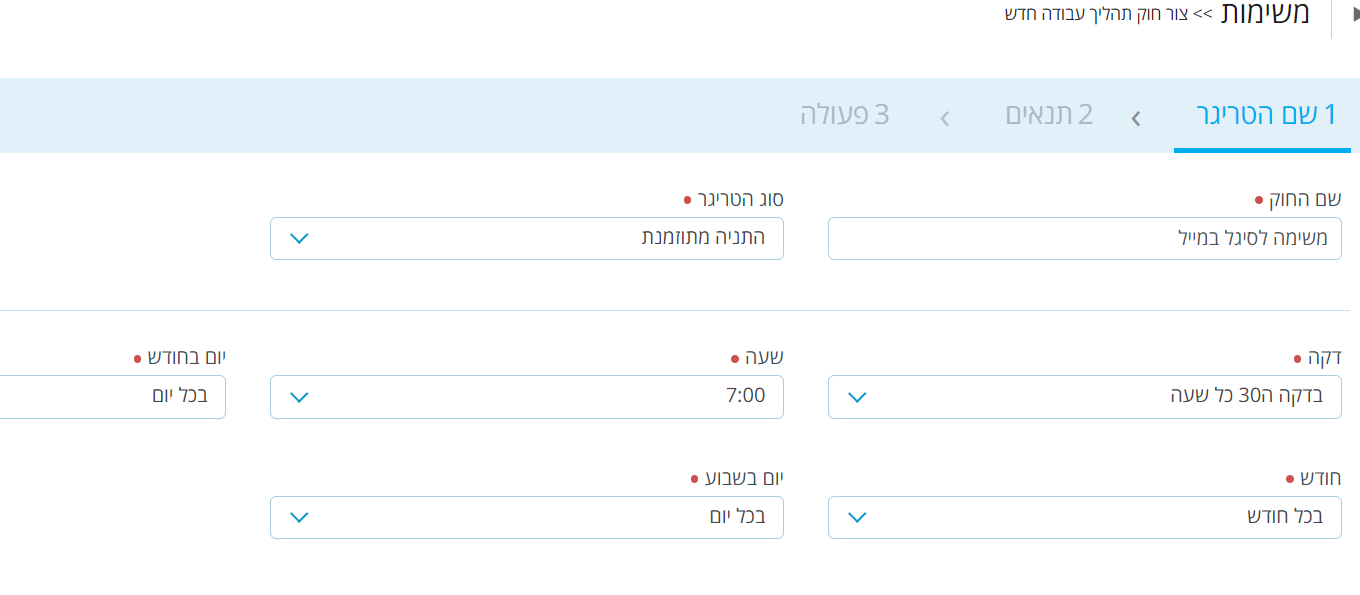 אני רוצה לעשות תהליך עבודה באוריגמי שיישלח מייל בשעה ותאריך המופיע בשדה מסויים. יש אפשרות? כי מצאתי רק אפשרות של תהליך עבודה ב''תאריך'' שווה ל''היום'' אבל לא מוצאת אפשרות של שעה.