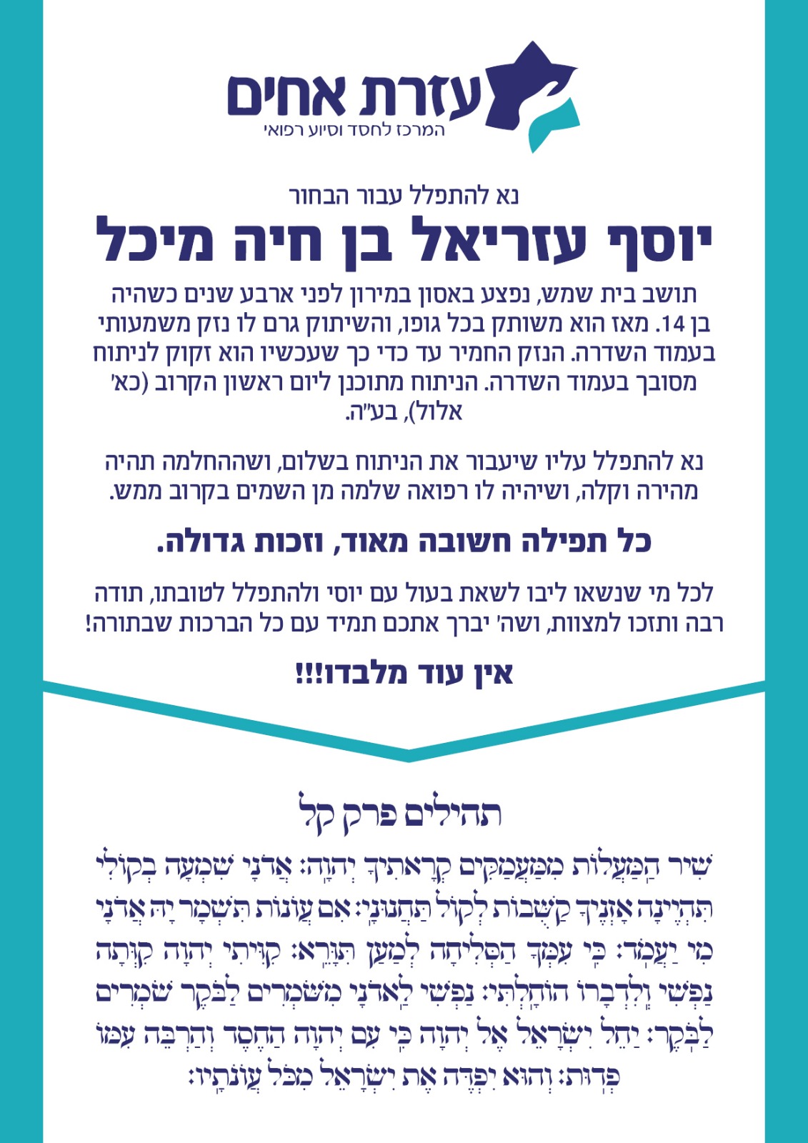 אשמח אם תתפללו ותקדישו פרק תהילים לרפואתו השלימה ל-