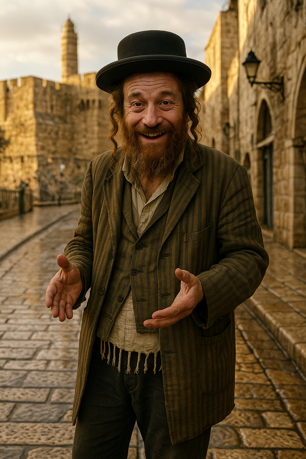 בינתיים זה הכי קרוב שהצלחתי, ירושלמי ריאליסטי, (הקושי בעיקר הבגד, אצלי GPT לא מכיר את זה, הייתי צריך להגדיר את הבגד בפרוטרוט המון פעמים..)