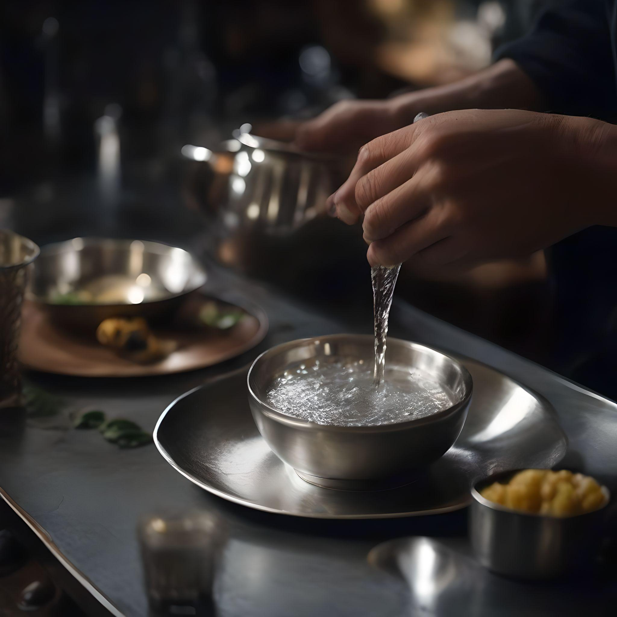 a-small-silver-vessel-from-which-water-is-poured-into-a-silver-bowl-370747939.png