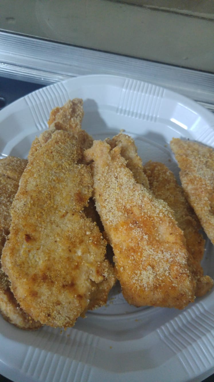 אני מצפה שניצלים בפירורי לחם, ושמשום ותבלינים (מעורבבים יחד)