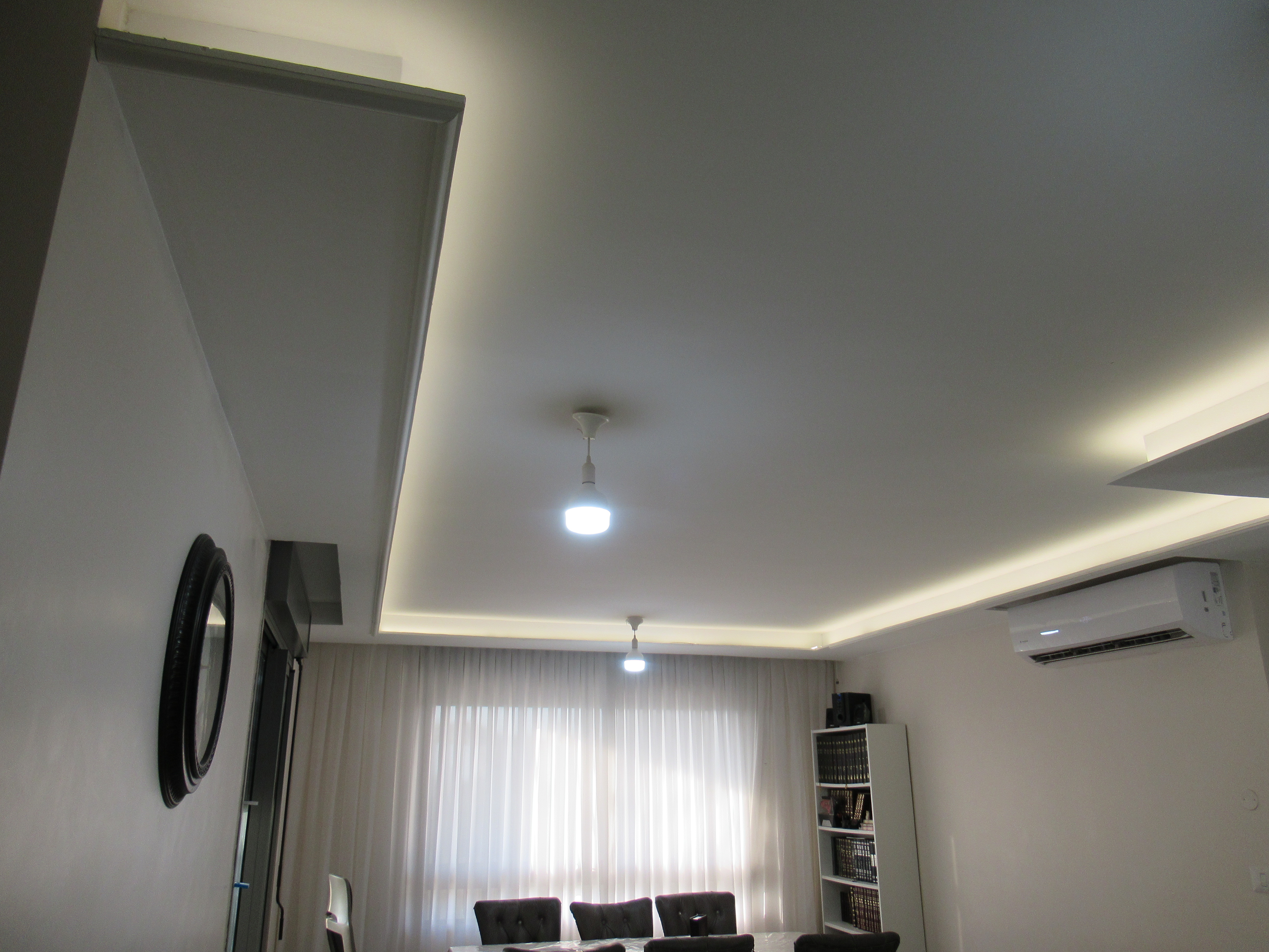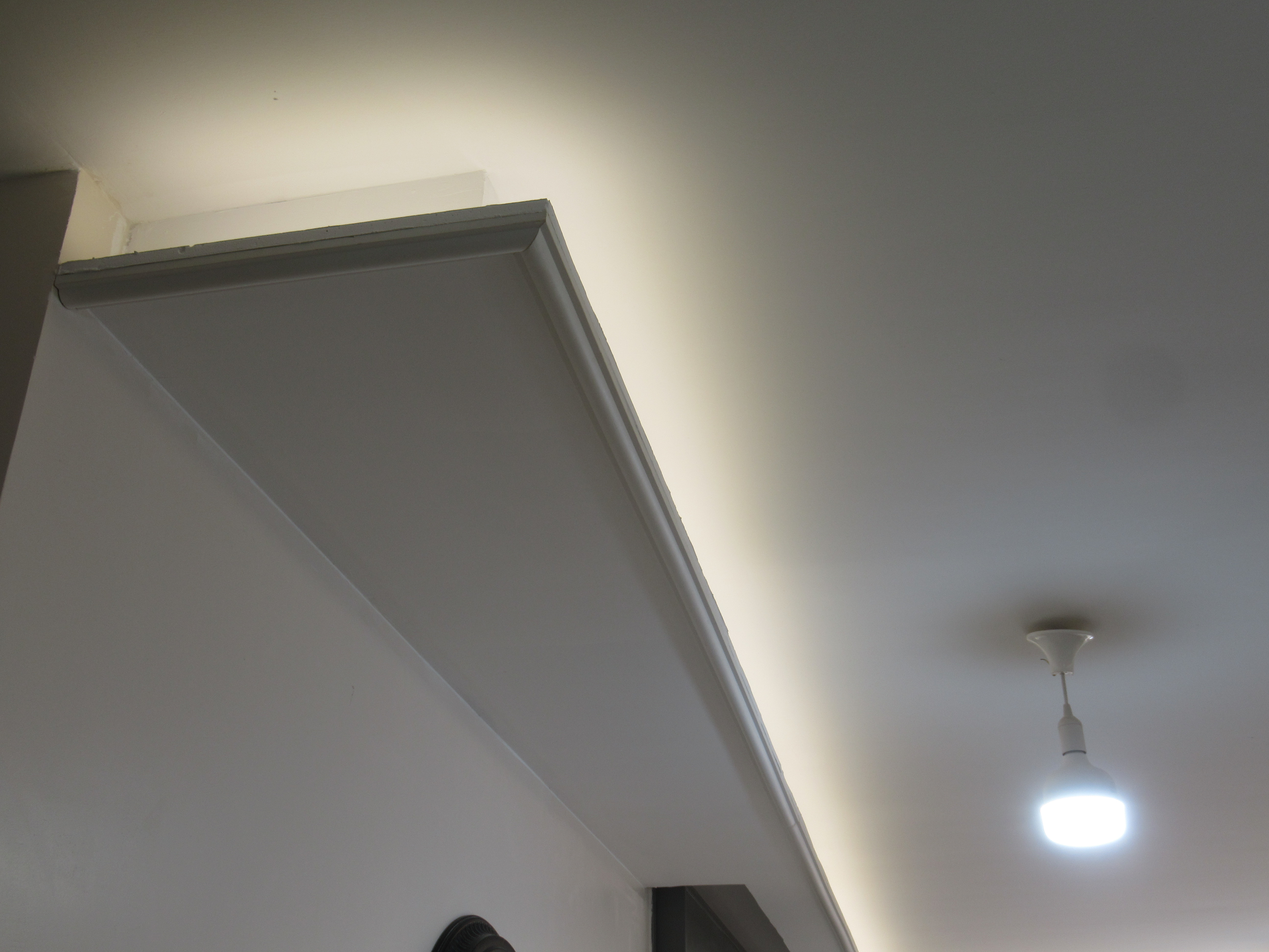 בניתי סינר גבס היקפי בסלון לצורך תאורה נסתרת [רוחב 35 ס"מ גובה 12 ס"מ] השארתי את קצה המדף פתוח ועשיתי [באמצע ביצוע] קרניז בקצה כמסגרת