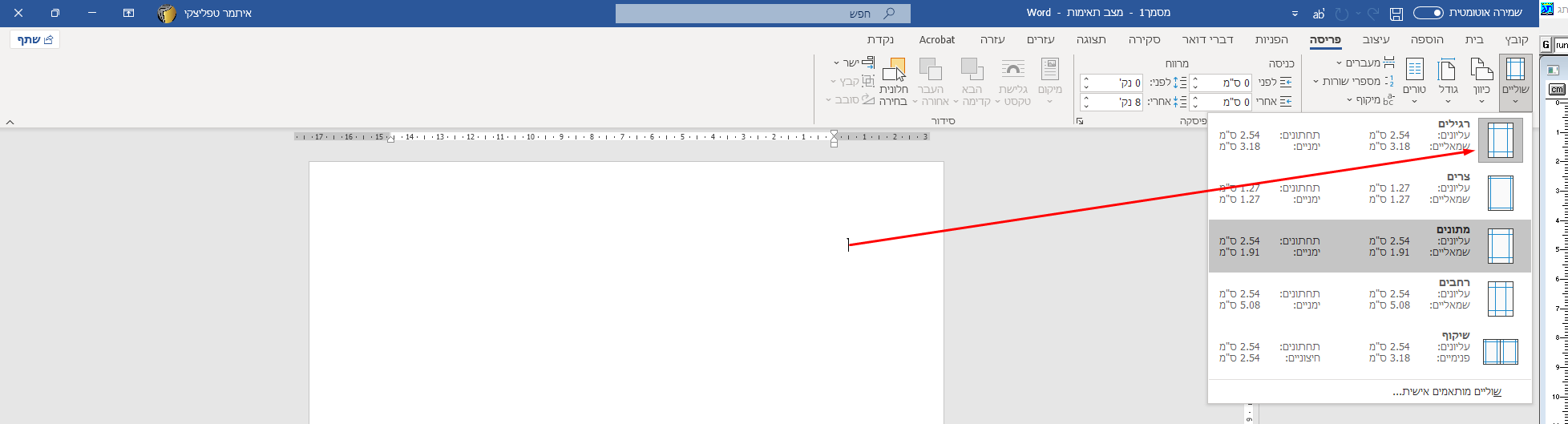 קיבלתי קבצי וורד לעריכה, שבכולם הטקסט לא באמצע הדף, מצו"ב תמונה.