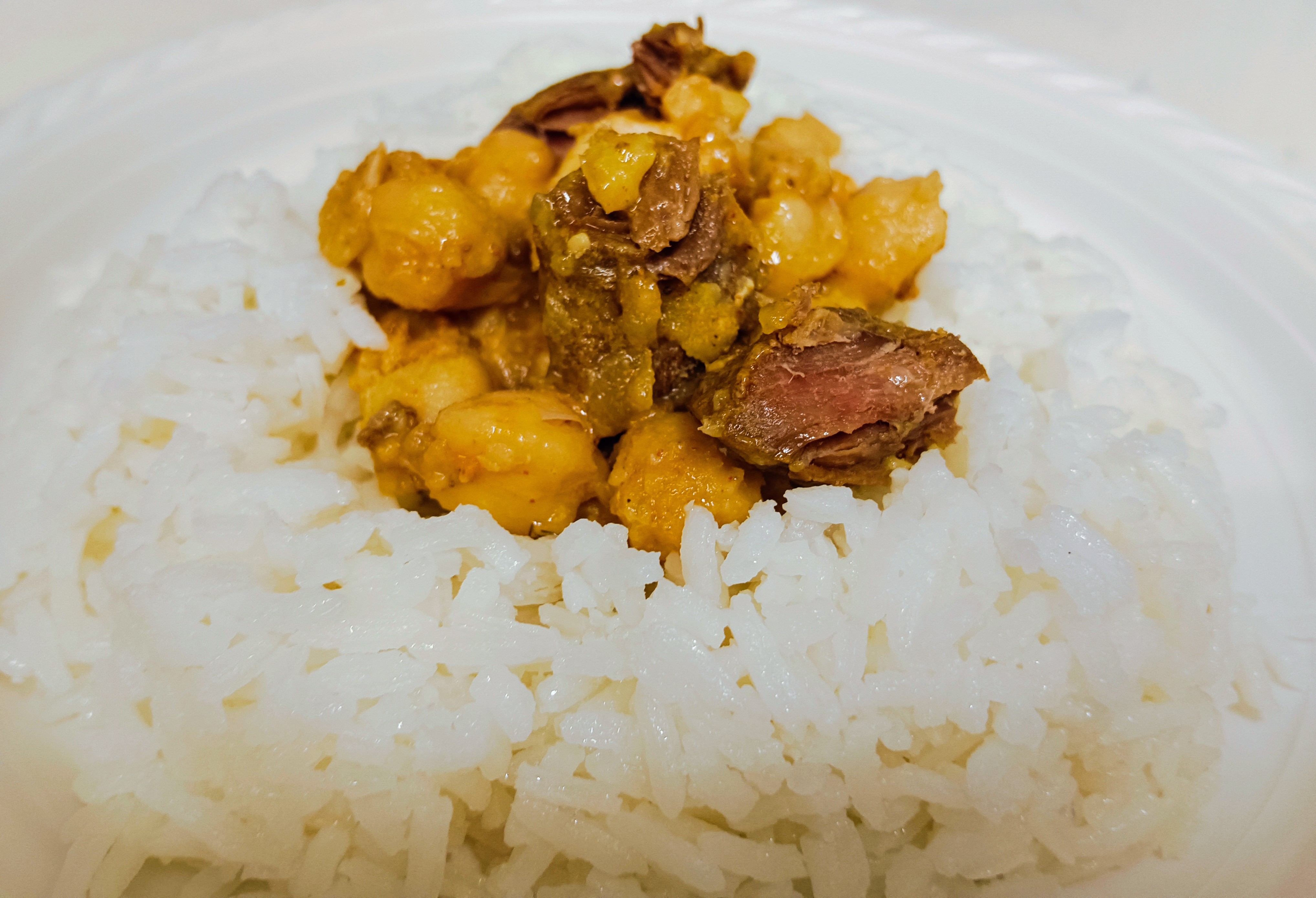 למעלה תבשיל שעועית חומוס עם קוביות בקר וחזה עוף