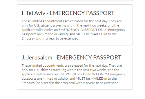 As of February 6, there is now one appointment system for both Jerusalem and Tel Aviv for passport (both regular and emergency), Consular Reports of Birth Abroad, and notary services. The system can be accessed