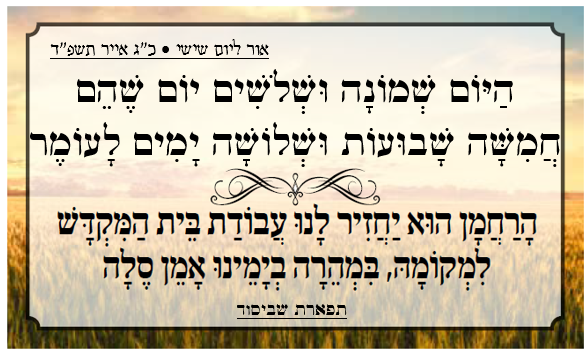 הַיּוֹם שלושה וארבעים יום שהם ששה שבועות ויום אחד לעומר