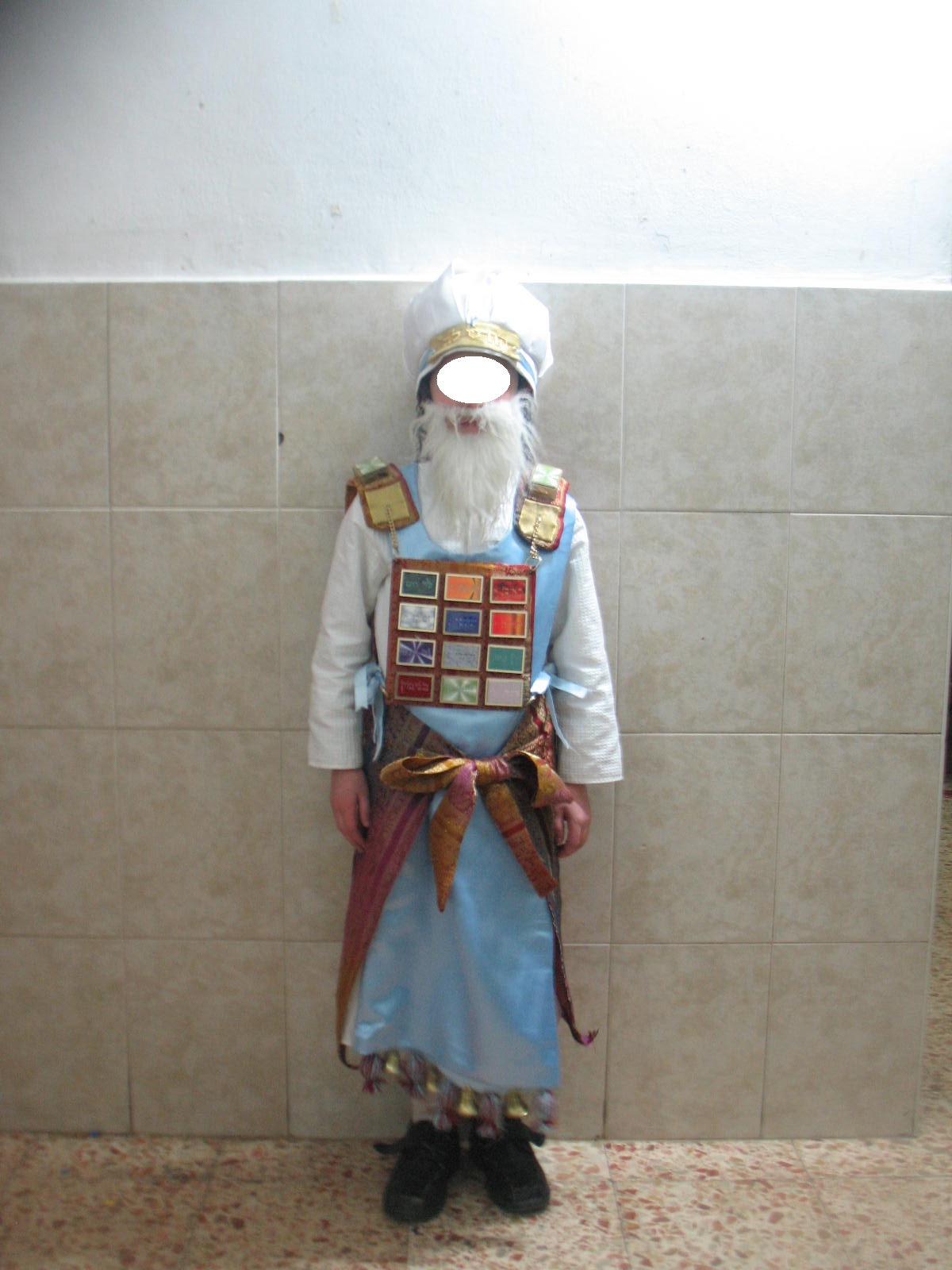 התחפושת כוללת: בגד, חגורה, כובע, כבשה ושק עם מצות.
