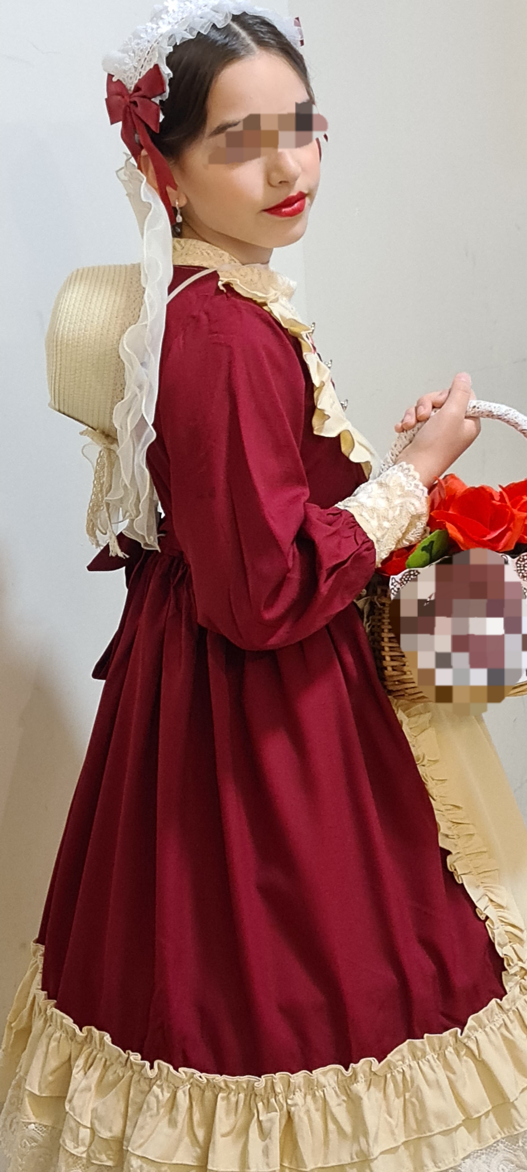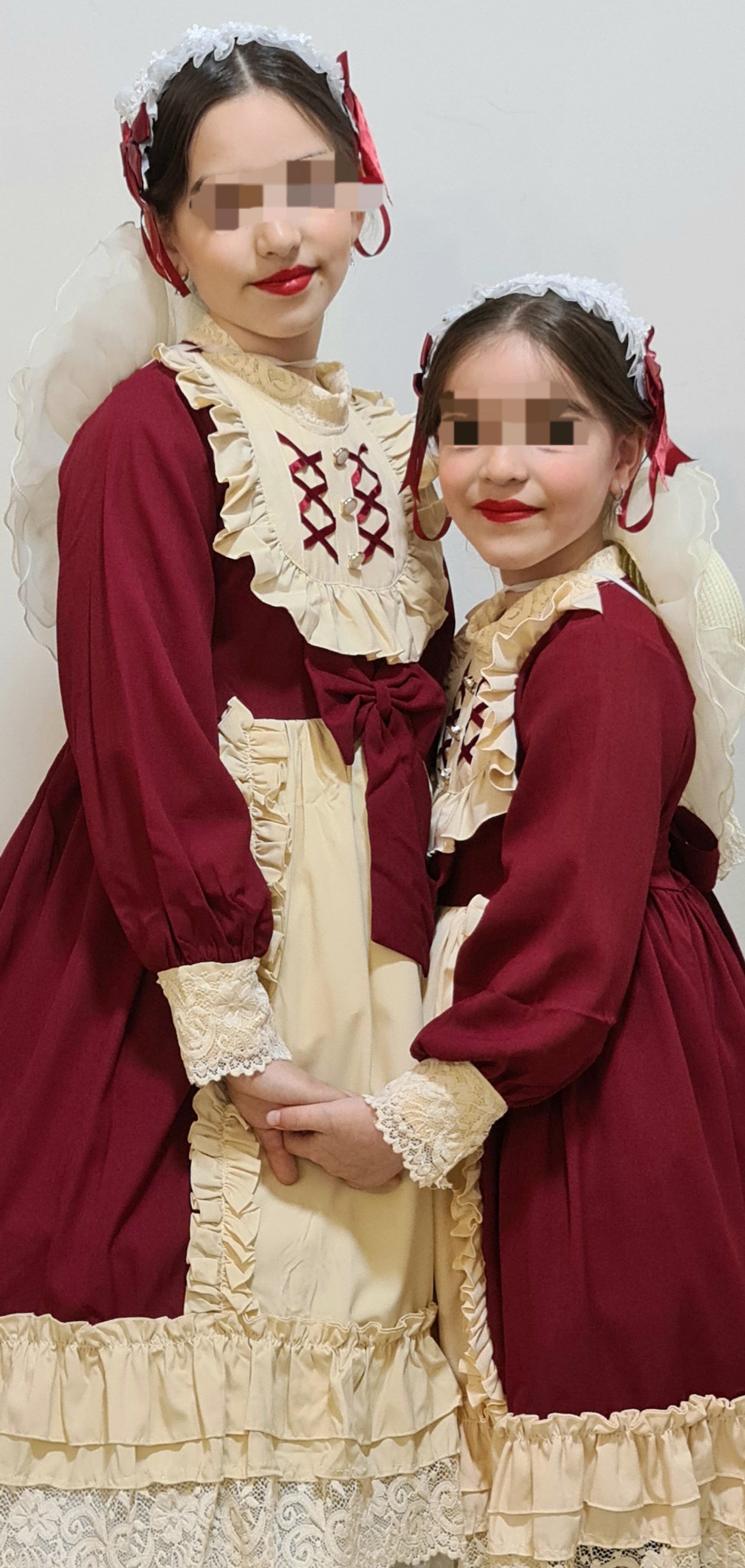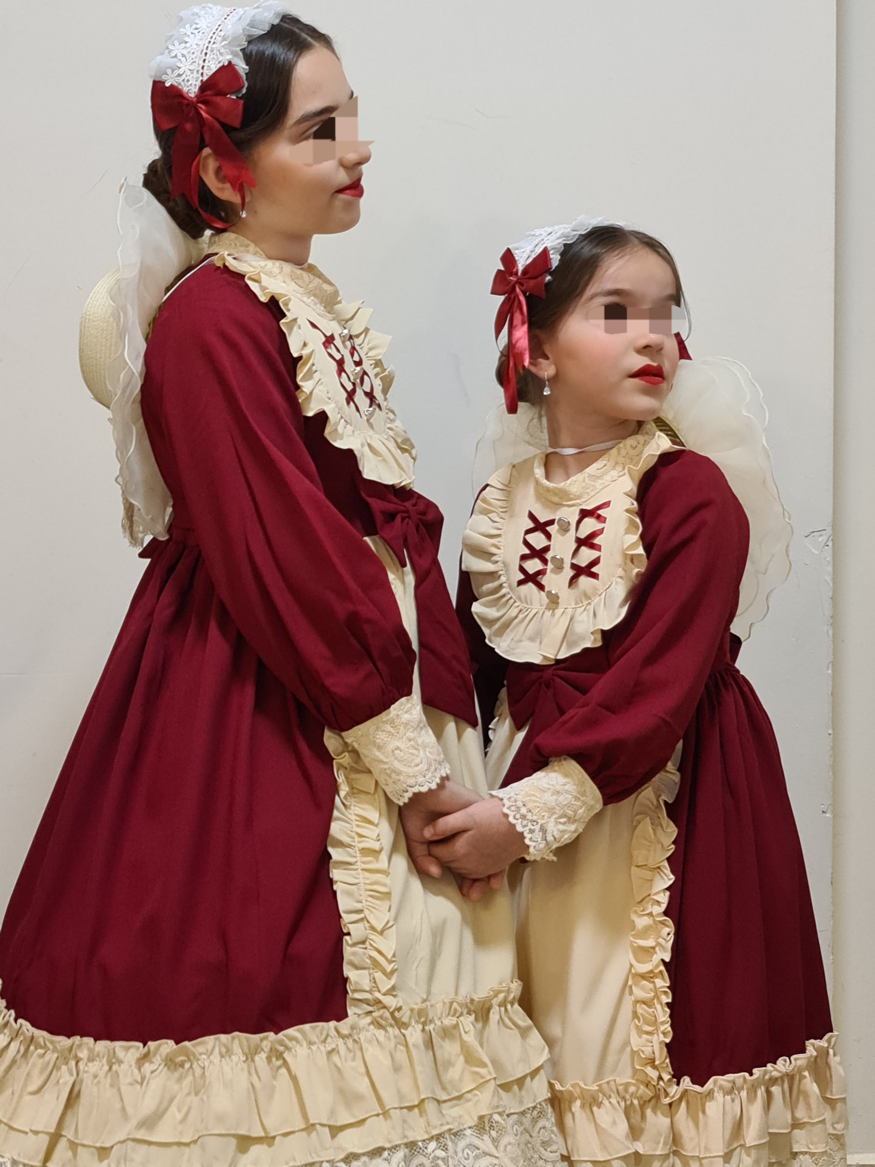 במקור מדובר בשמלות ארועים שניקנו בקידישיק ועברו אצל תופרת שידרוג לתחפושת. מגיעות עם הכובע שבתמונה וכפפות תחרה.