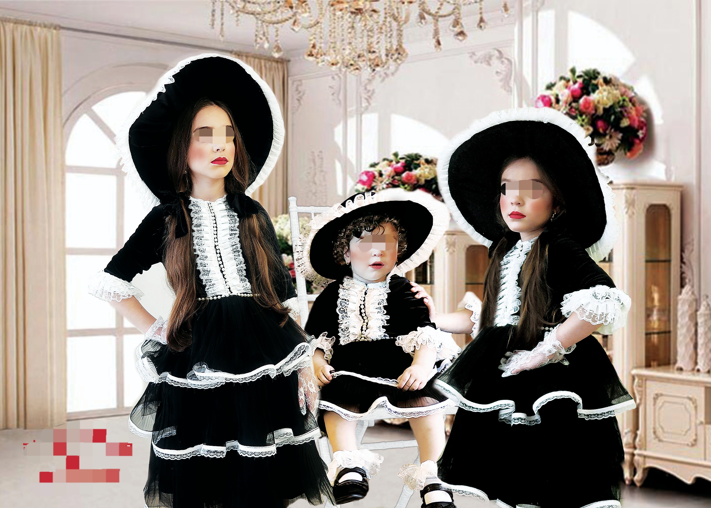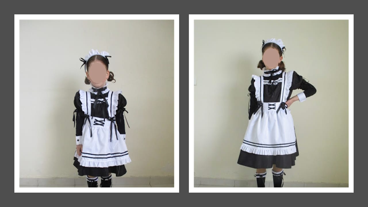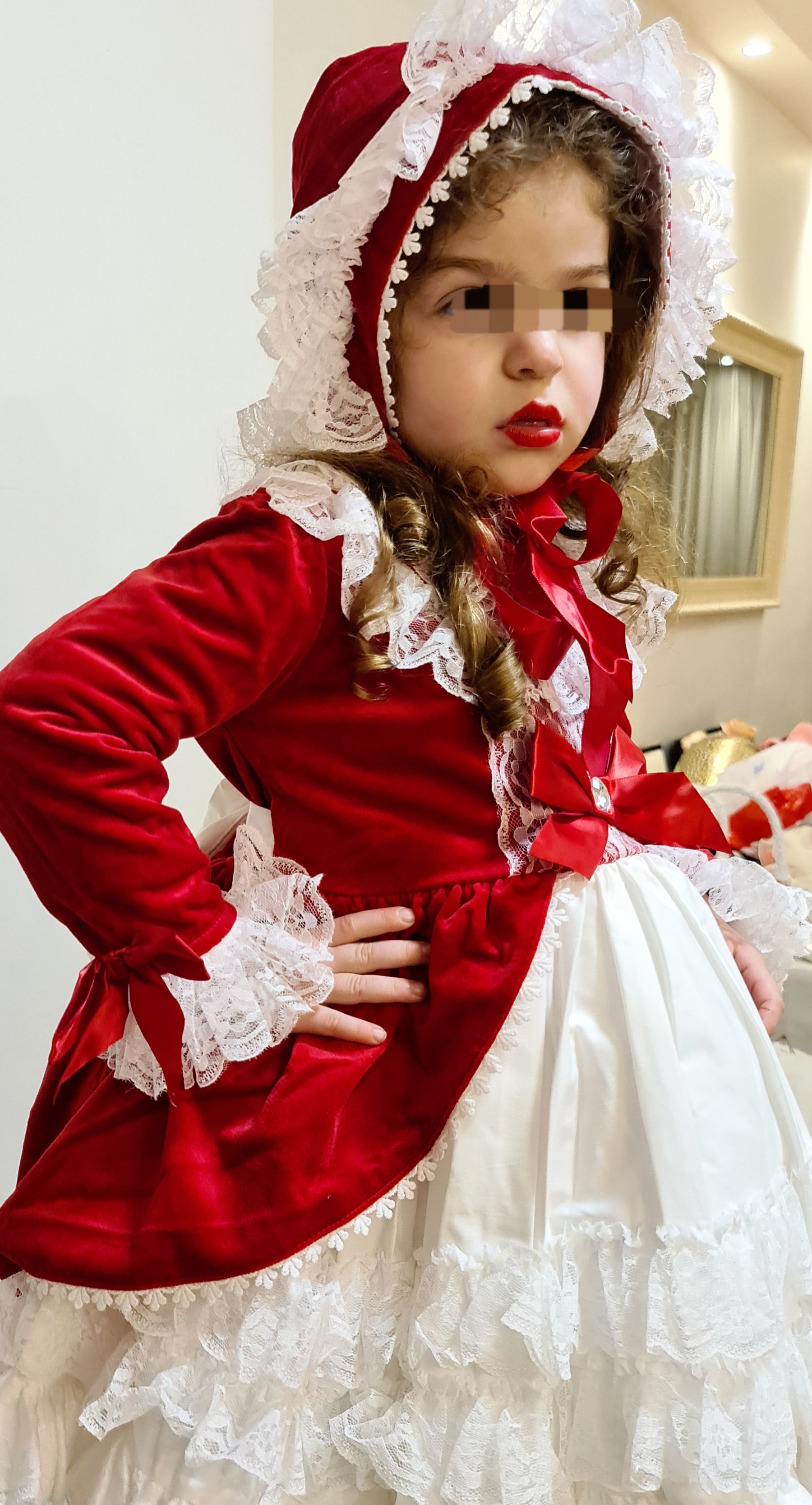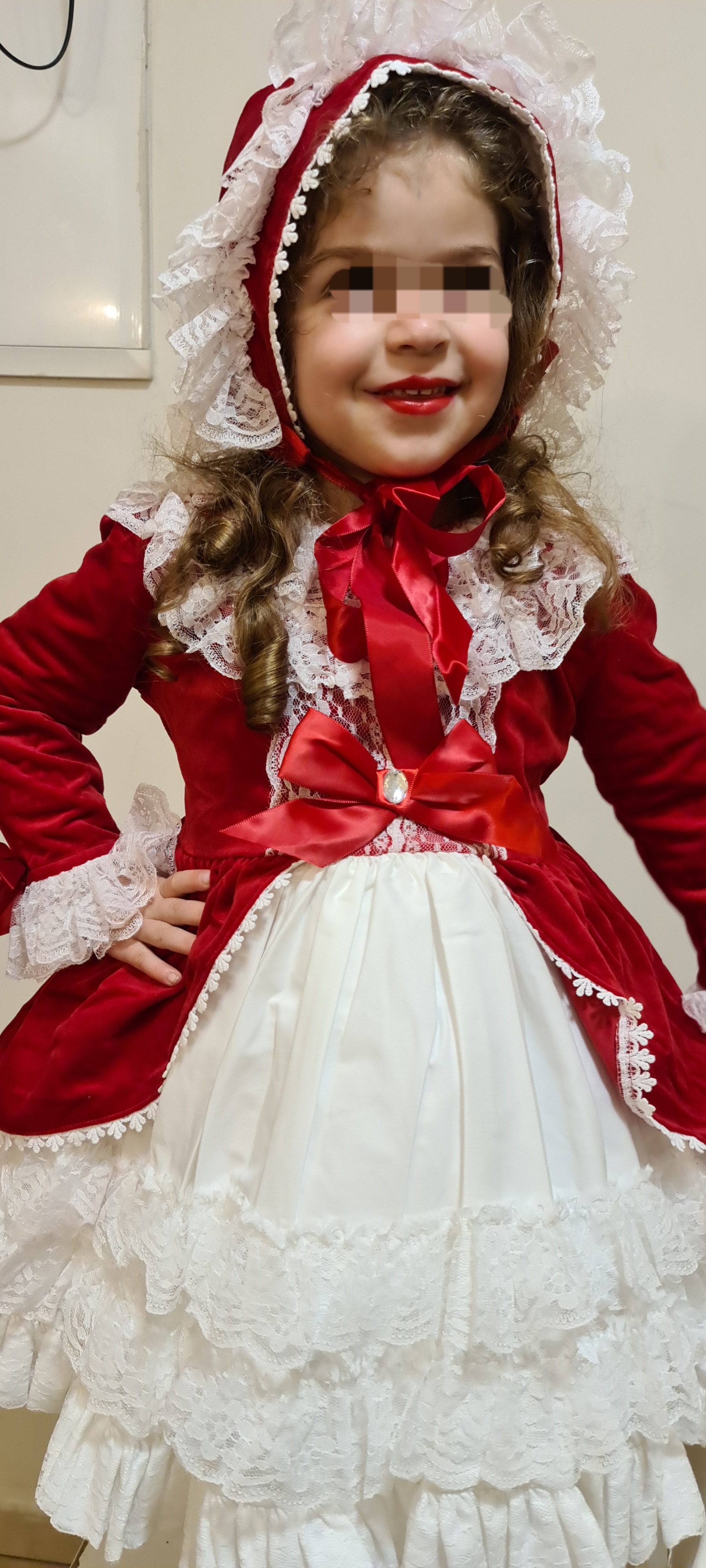במקור מדובר בשמלות ארועים שניקנו בקידישיק ועברו אצל תופרת שידרוג לתחפושת. מגיעות עם הכובע שבתמונה וכפפות תחרה.
