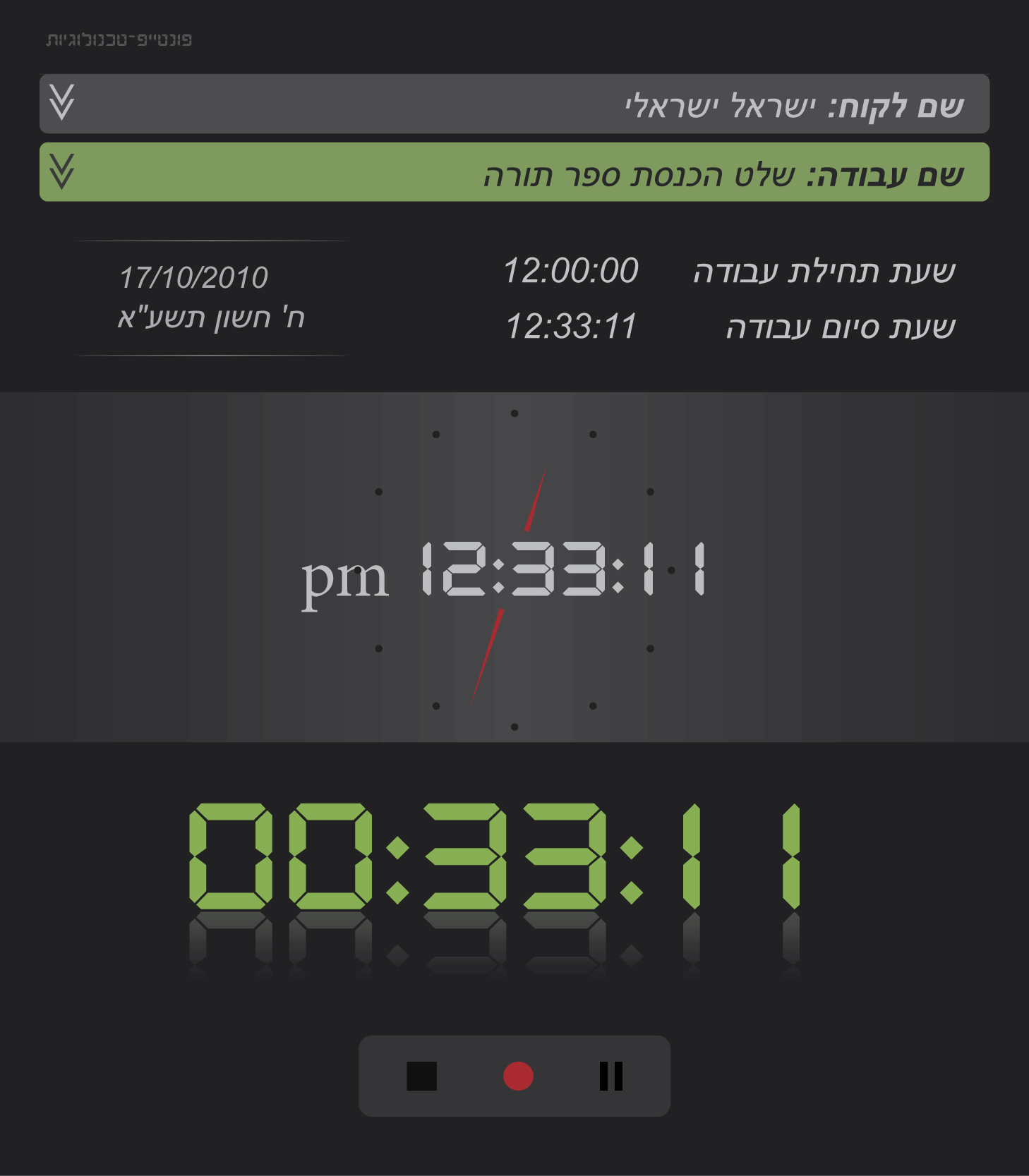 לא לדעת מה השעה עכשיו וגם לא מאיזו שעה עד איזו שעה עבדנו. נכון, גם הנתונים האלו חשובים לנו, אבל הם משניים ביחס לייעוד העיקרי של השעון - לדעת כמה שעות עבודה נצברו לזכותינו.