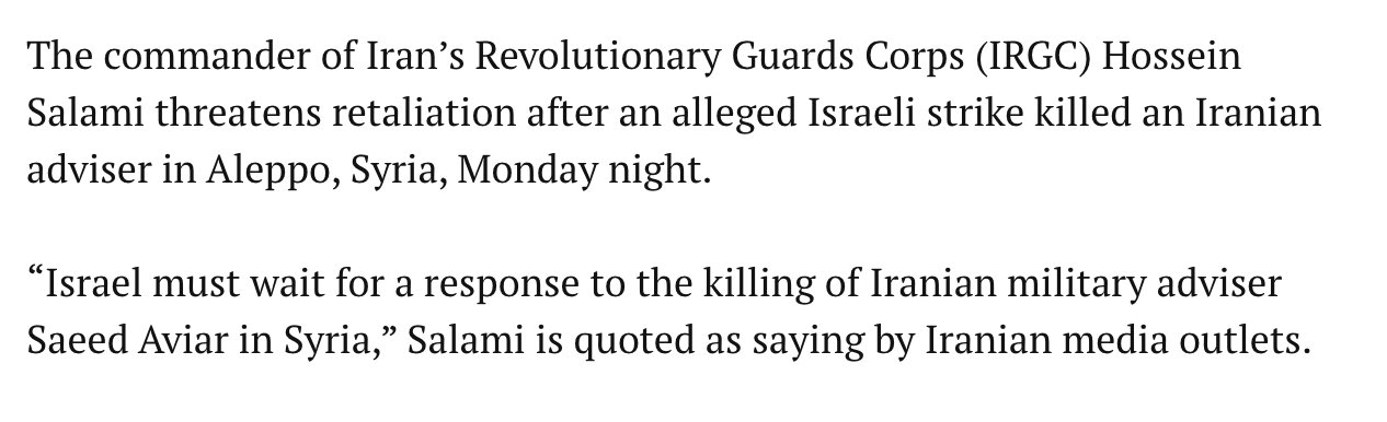 מפקד משמרות המהפכה חוסיין סלמי באיראן: "הציונים ישלמו ביוקר על מותו של סייד אביאר", היועץ הצבאי של המשמר שנהרג השבוע בתקיפה בחאלב, סוריה