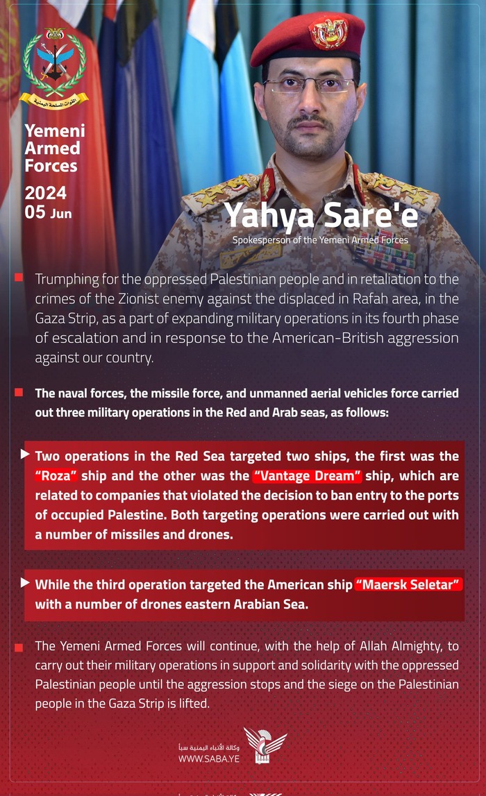 דובר החותים נתן הלילה הצהרה בדבריו אמר שתקפו שתי ספינות שהיו בדרכם לישראל וספינה אחת אמריקאית